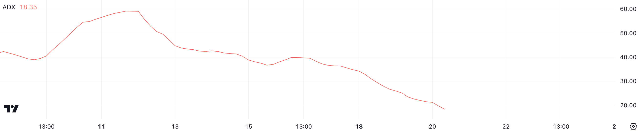 Sinusukat ng ADX ang lakas ng isang trend, kahit ano pa ang direksyon nito, na may mga pangunahing threshold na nagpapahiwatig ng iba’t ibang antas ng momentum. Ang mga halaga sa ibaba ng 20 ay nagpapahiwatig ng mahina o hindi umiiral na trend, habang ang mga pagbasa sa itaas ng 25 ay nagpapahiwatig ng malakas na trend na nakakakuha ng traksyon.