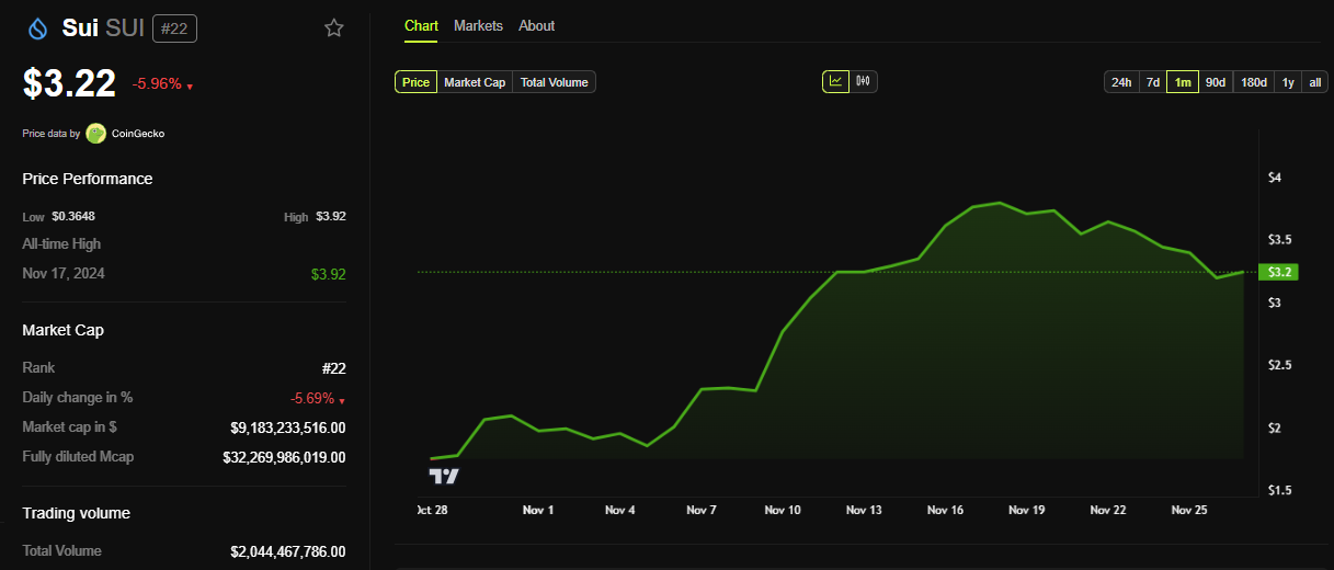 Sa kabila ng balita ng integration na ito, bumaba ng halos 6% ang powering token ng Sui, ang SUI, mula nang magbukas ang session noong Martes. Ipinapakita ng data ng BeInCrypto na nagte-trade ang SUI sa halagang $3.22 sa oras ng pagsulat na ito.