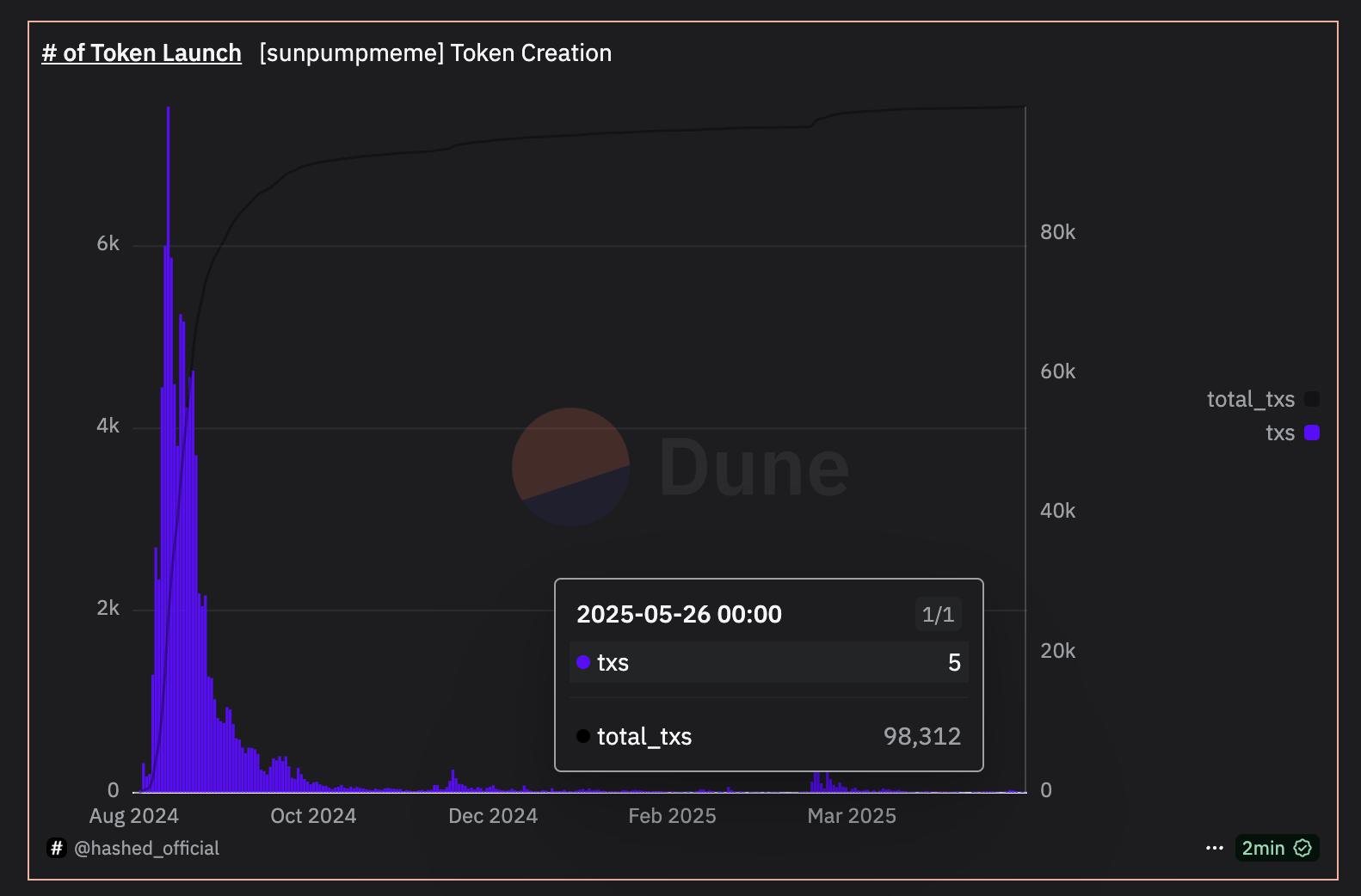 Gayunpaman, ang on-chain metrics ng SunPump ay nagpapakita ng mas tahimik na sitwasyon. Kahit na may bagong anunsyo, nasa 98,300 token launches lang ang nakita sa nakaraang siyam na buwan—isang bilang na madalas nalalampasan ng Pump.fun sa loob lang ng isang linggo.