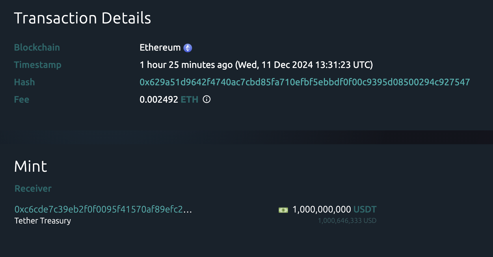Ayon sa bagong on-chain data, nag-mint ang Tether ng USDT tokens na nagkakahalaga ng $1 billion. Kamakailan lang, nag-mimint sila ng malalaking volume at nag-report ng record profits sa Q3 2024.