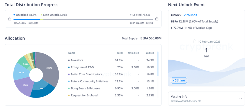 Noong February 10, mag-u-unlock pa ang project ng 12.98 million tokens. Ang karamihan sa mga token na ito ay ipapamahagi sa “Request for Broposal” (RFB) initiative. Ito ay mag-i-incentivize sa mga developer, community contributors, at liquidity providers sa loob ng Berachain ecosystem.