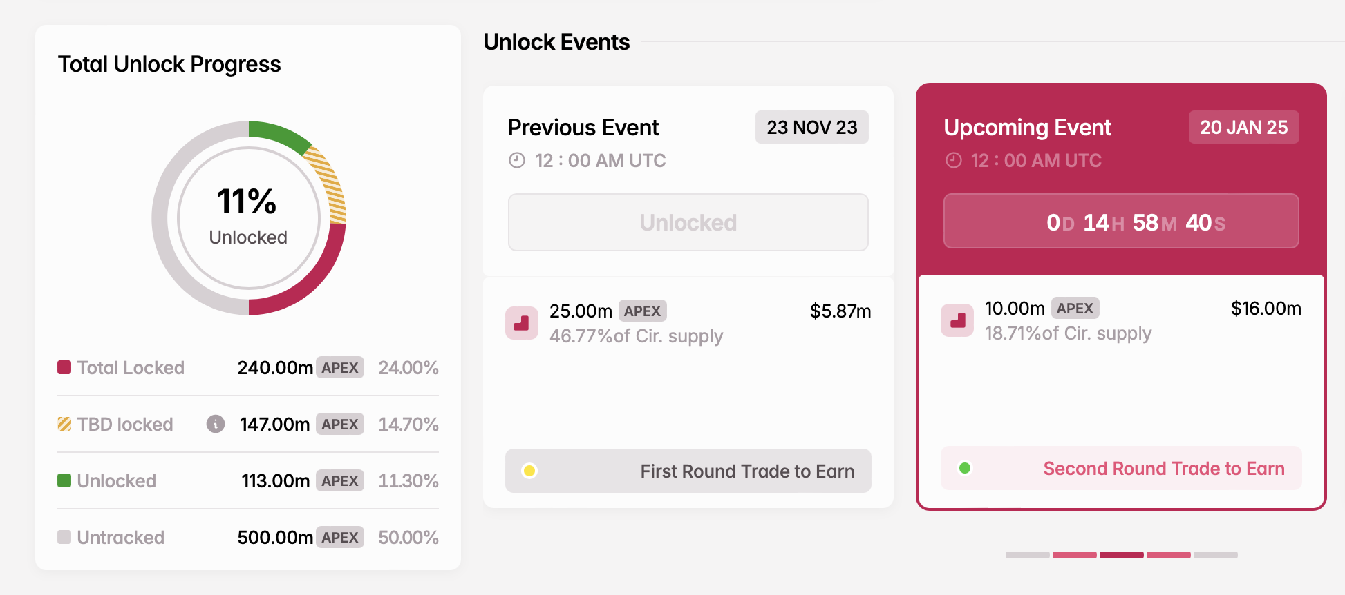 Sa January 20, mag-u-unlock ang ApeX ng 10 million APEX tokens, na kumakatawan sa 18.71% ng kasalukuyang circulating supply nito.