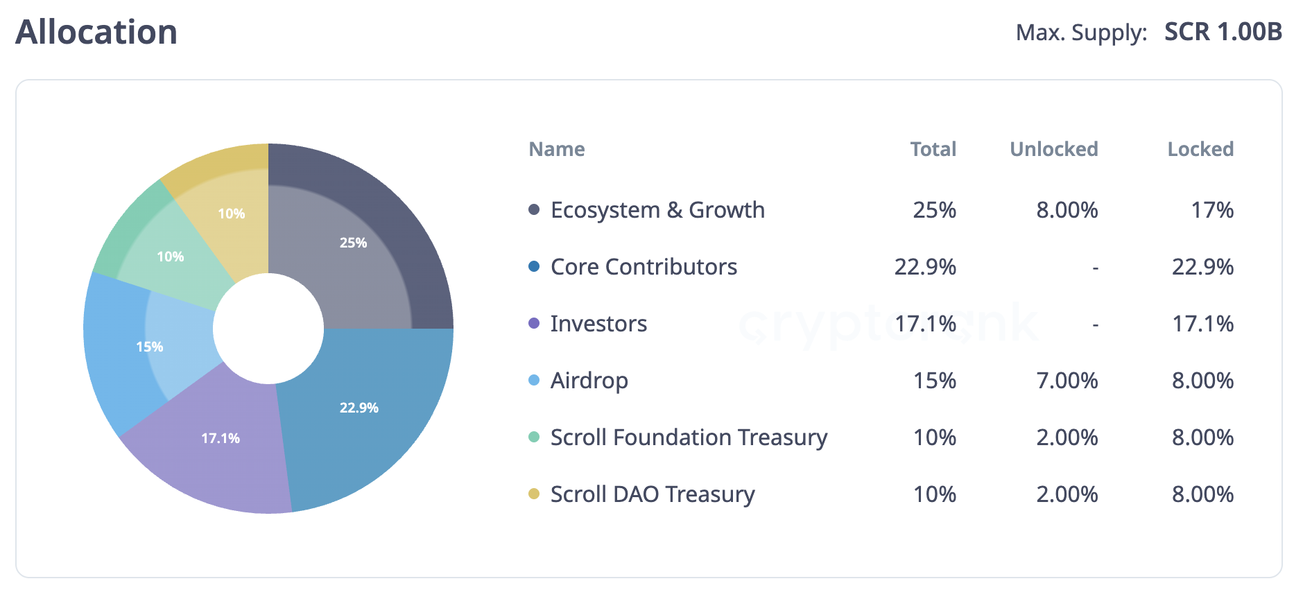 Sa April 22, 40 million SCR tokens na nagkakahalaga ng humigit-kumulang $11.52 million ang ma-u-unlock. Pwedeng magdala ito ng dagdag na liquidity sa market at posibleng magdulot ng renewed interest sa Scroll. Ang presyo nito ay bumaba ng humigit-kumulang 46% sa nakaraang 30 araw, at ang market cap nito ay nasa $55 million, bumaba mula sa peak na $265 noong October 2024.