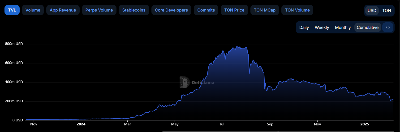 Ayon sa data mula sa DefiLlama, The Open Network (TON) ay nakaranas ng peak sa Total Value Locked (TVL) noong kalagitnaan ng Hulyo, na umabot sa $773 million.