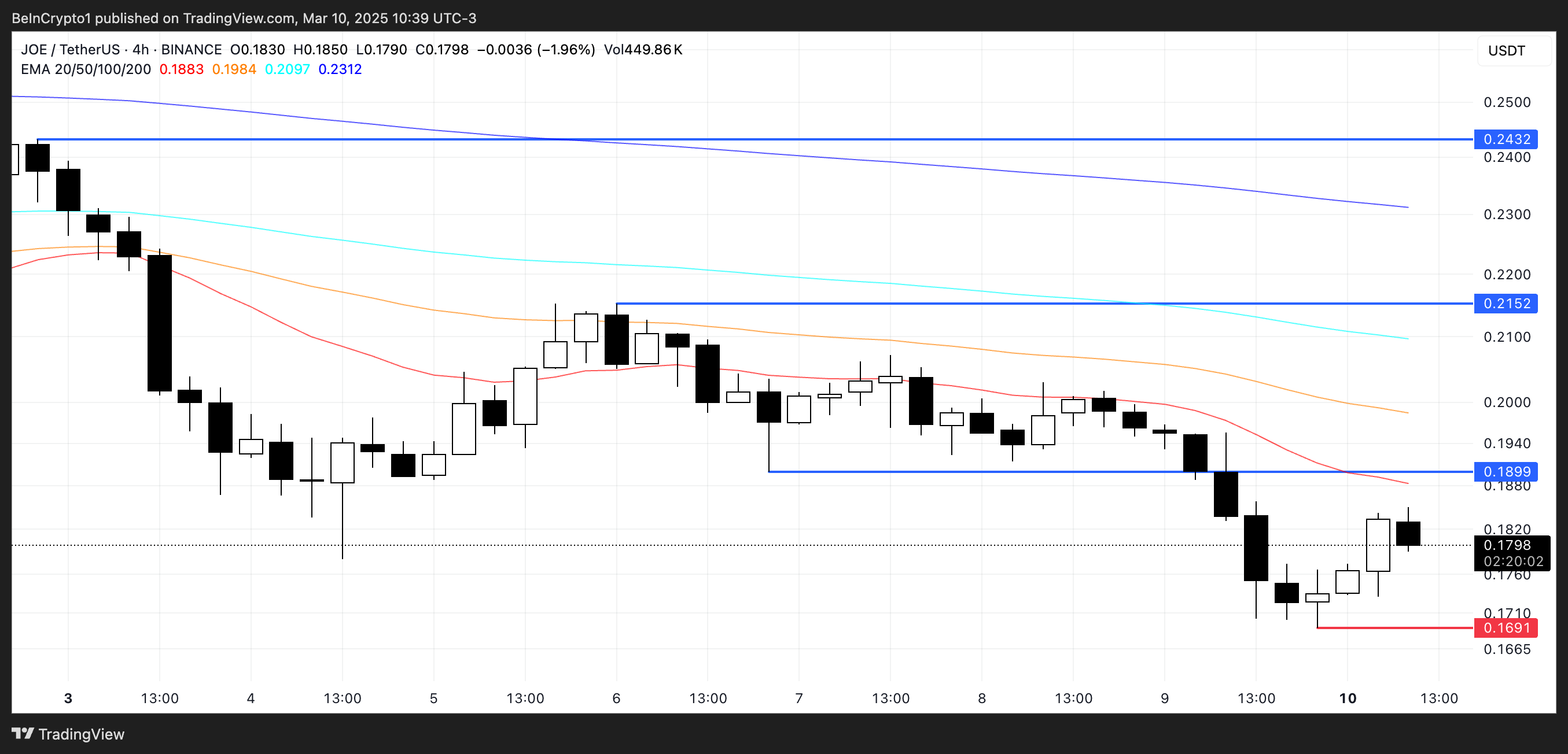 Gayunpaman, kung ang kasalukuyang downtrend ay magpatuloy, pwedeng i-test ng JOE ang support sa $0.169, at ang breakdown sa ibaba ng level na ito ay maaaring magdala nito sa ibaba ng $0.16.