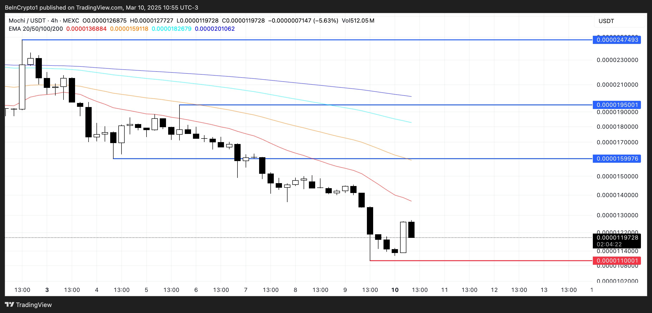 Kung makakabawi ang MOCHI at mag-rebound ang mga meme coins, pwedeng i-test nito ang resistance sa $0.0000159, at ang mga karagdagang breakout ay maaaring itulak ito patungo sa $0.0000195 at $0.0000247.