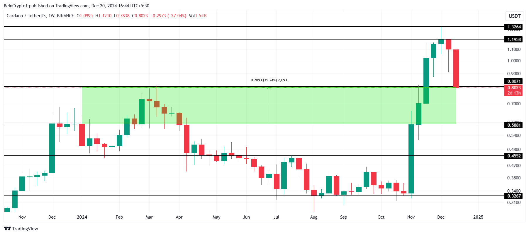 Nag-register ang Cardano ng isa sa pinaka-disappointing na takbo sa lahat ng malalaking altcoin dahil tumaas lang ito ng 35% sa loob ng 12 buwan. Ang 27% na pagbaba ngayong linggo ay nagbura ng malaking bahagi ng gains na naitala noong Q4, na nagdala sa altcoin sa $0.80.