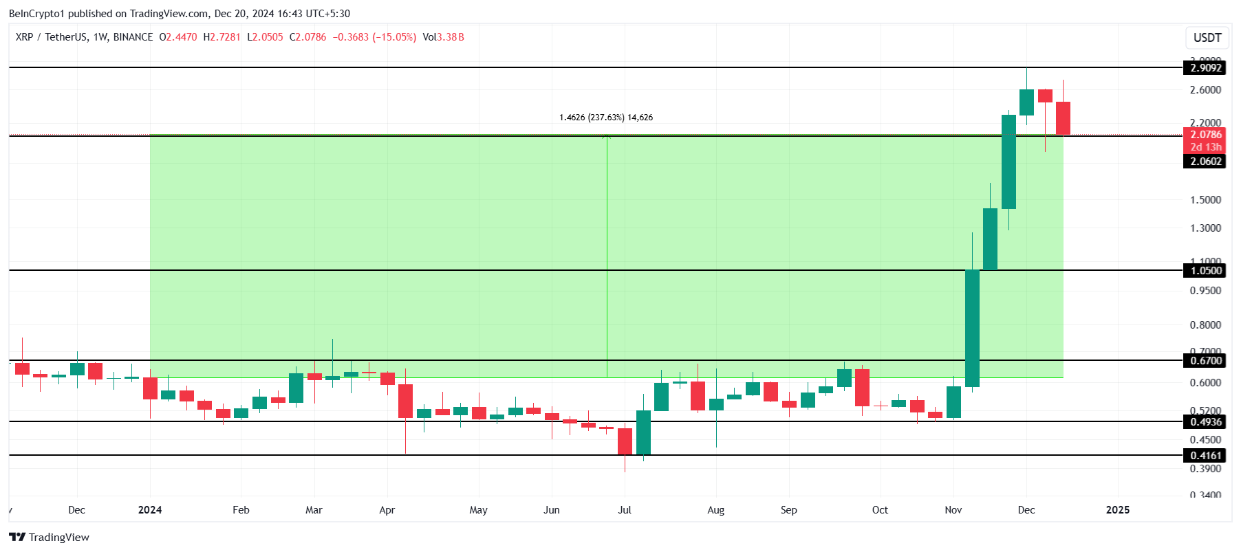 Habang hindi naging maganda ang taon ng XRP, nagkaroon ito ng impressive na Q4. Sa huling quarter, tumaas ang XRP mula $0.49 para maabot ang year-to-date highs na $2.90, bago bumagsak sa $2.07 sa kasalukuyan. Ang matinding pagtaas na ito ay nagdala ng YTD growth sa 237%.