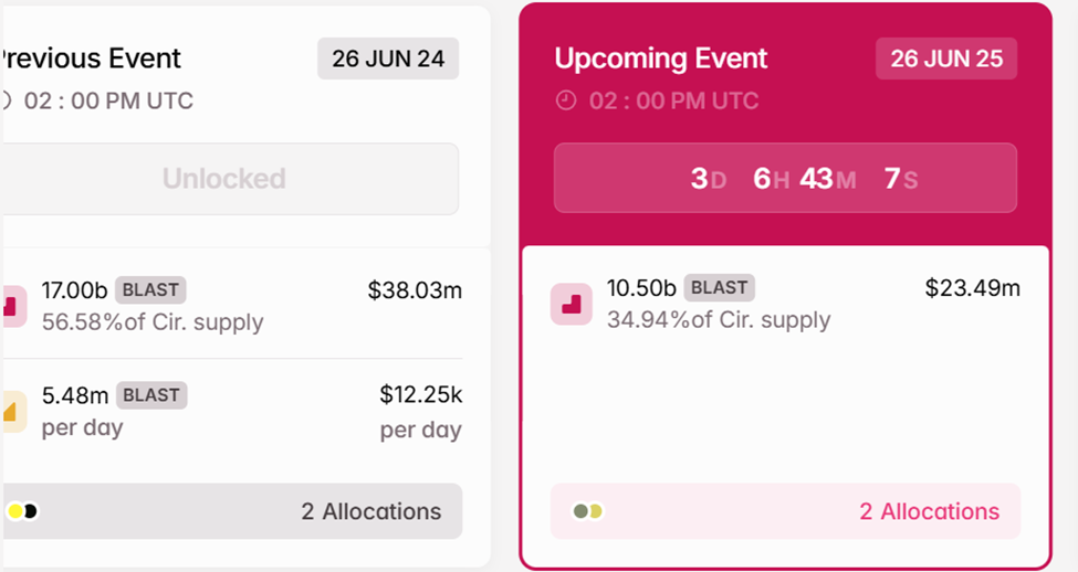 Isa pang highlight sa crypto news ngayong linggo ay sa June 26, $23.49 million na halaga ng BLAST tokens, na nagrerepresenta ng 34.94% ng circulating supply nito, ang mag-u-unlock. Ang mataas na volume na unlock na ito, na binubuo ng 10.5 billion BLAST tokens, ay posibleng magdulot ng market volatility.