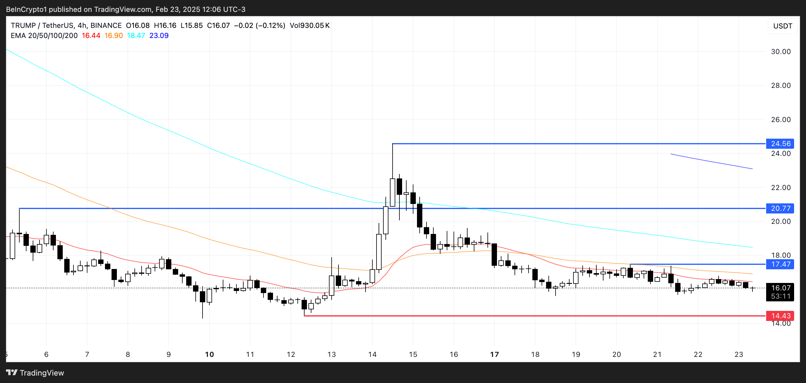 Ang TRUMP, ang pinaka-hyped na meme coin na nag-launch, ay kasalukuyang nagte-trade malapit sa all-time lows, nananatiling mas mababa sa $20 mula noong Pebrero 15. Matapos maabot ang highs na higit sa $70 sa mga unang araw nito, ang TRUMP ay nasa paligid ng $16 ngayon, na nagpapakita ng malaking pagbaba.