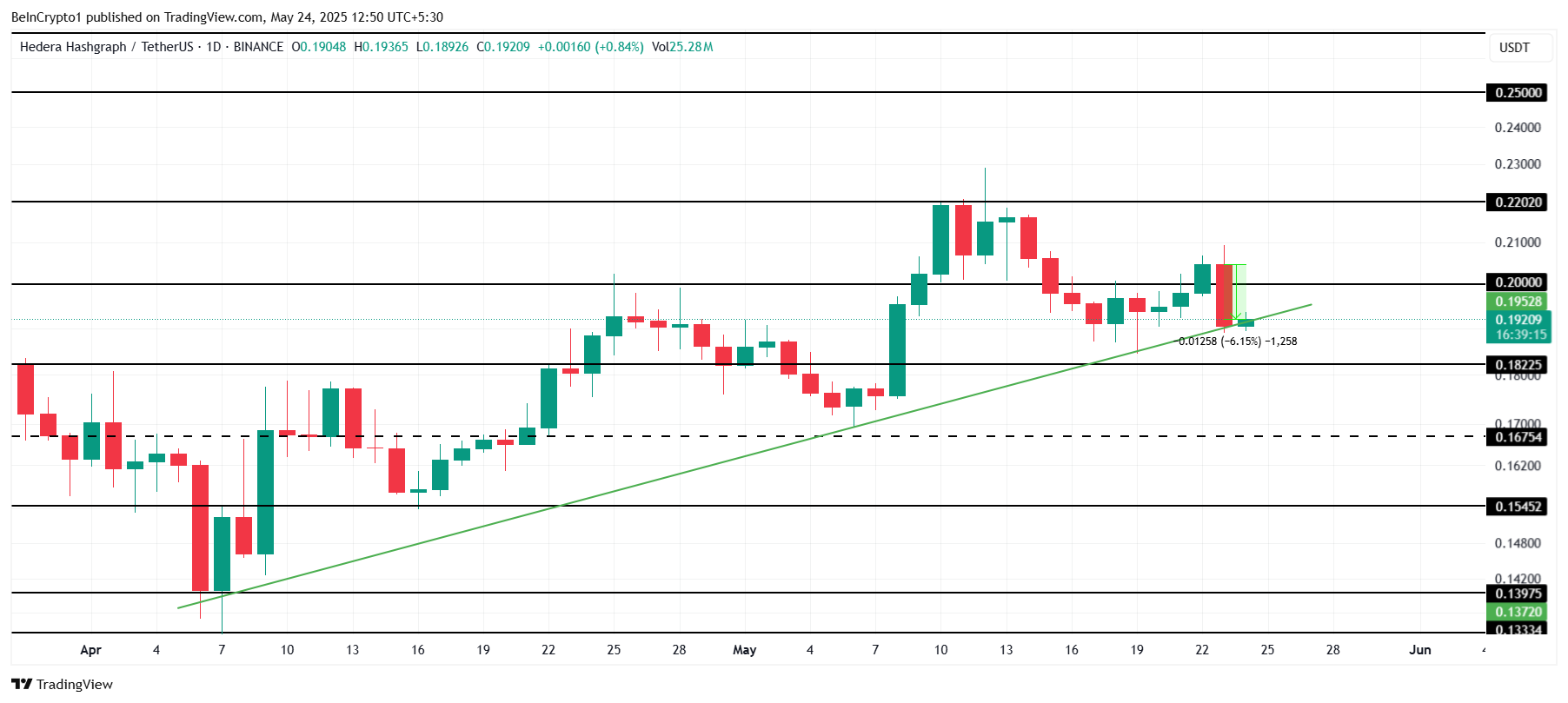 Sa ngayon, bumaba ng 6% ang presyo ng HBAR sa nakaraang 24 oras, at kasalukuyang nasa ilalim ito ng kritikal na $0.20 level.