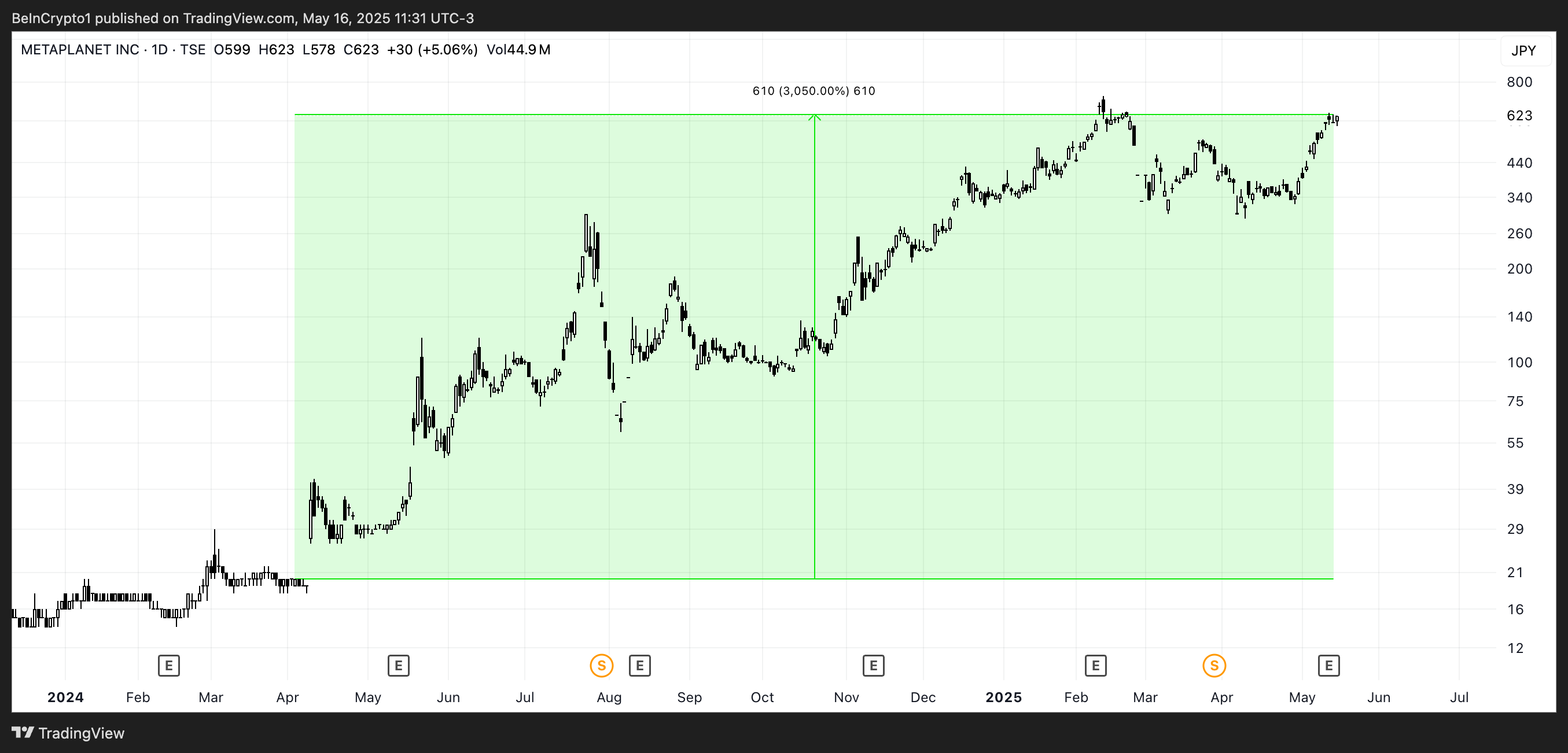 Unang nagdagdag ang Metaplanet ng Bitcoin sa kanilang balance sheet noong Abril 2024 at ngayon ay may hawak na 5,555 BTC na nagkakahalaga ng humigit-kumulang $576.8 million. Mula nang gawin ang unang hakbang na ito, tumaas ng mahigit 3,000% ang stock ng kumpanya, na may mga kamakailang filing na nagpapakita ng 15x na pagtaas sa presyo ng share ngayong taon.