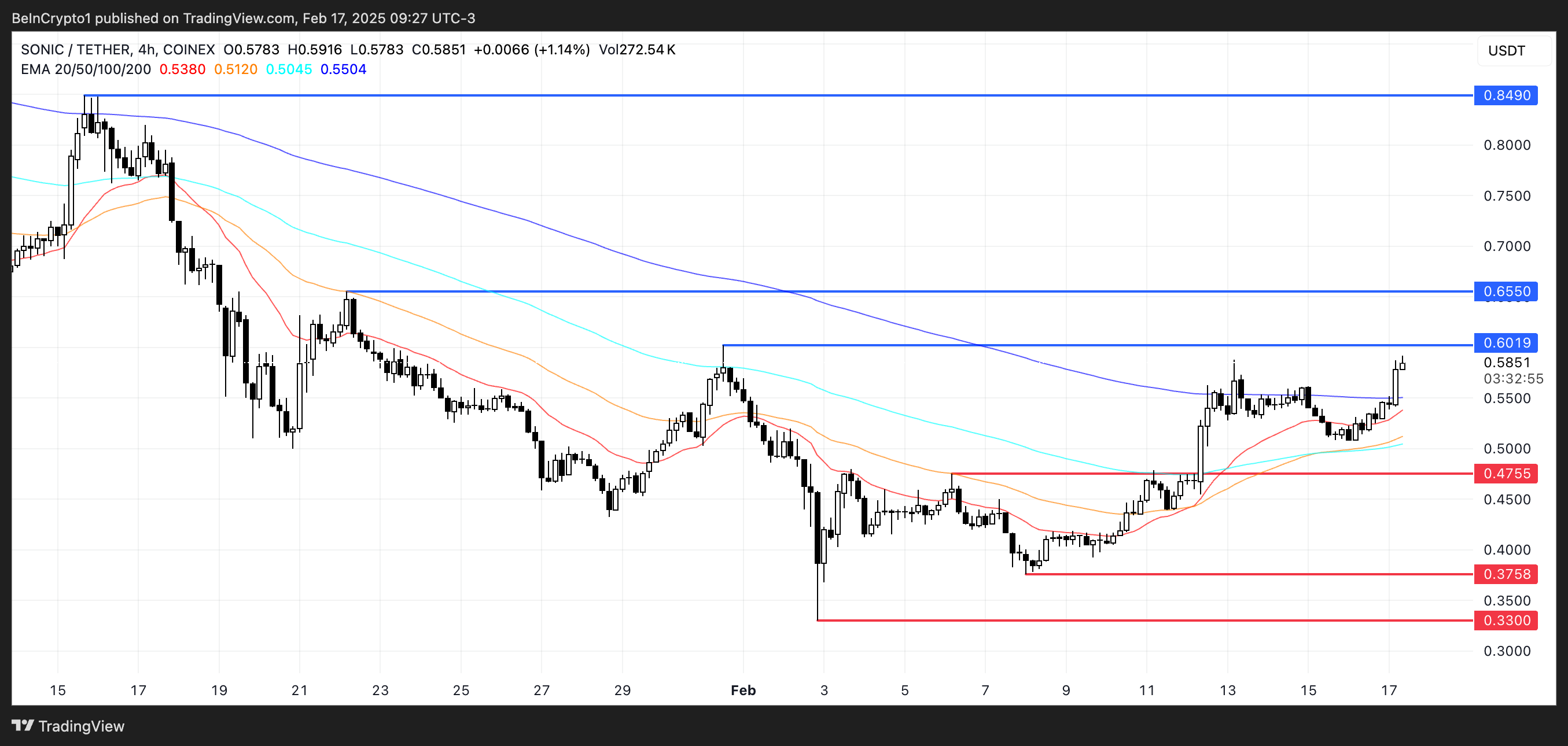 Ang EMA lines nito ay nagpapakita ng bullish momentum, na may golden cross na nag-form ilang araw na ang nakalipas at isa pang posibleng paparating. Kung mangyari ito, maaaring i-test ng S ang resistance sa $0.60, at ang breakout ay maaaring magtulak dito sa $0.65.
