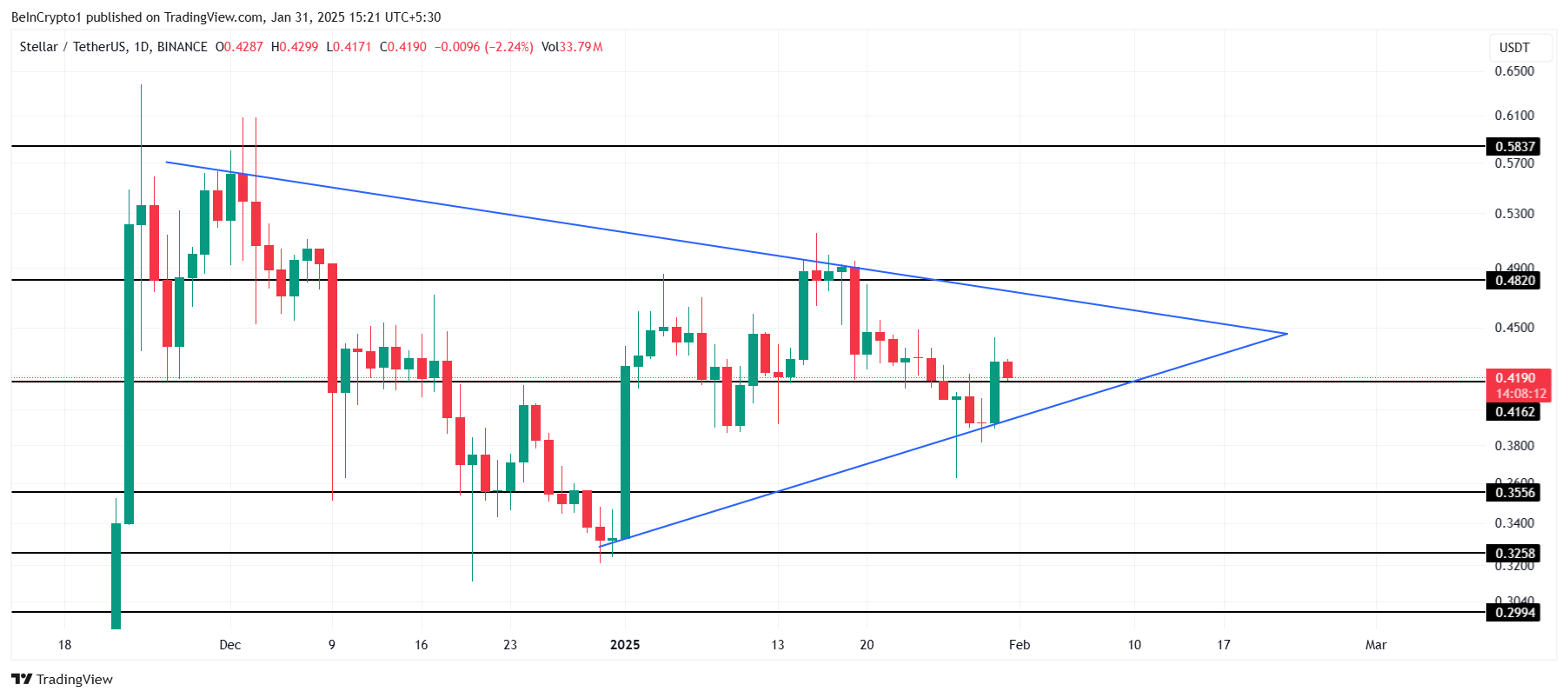 Pero kung hindi makuha ang support sa $0.416, puwedeng humina ang market sentiment. Kung mawala ng XLM ang level na ito, puwede itong maging vulnerable sa pagbaba papuntang $0.35, na mag-i-invalidate sa bullish outlook at mag-extend ng consolidation phase nito.