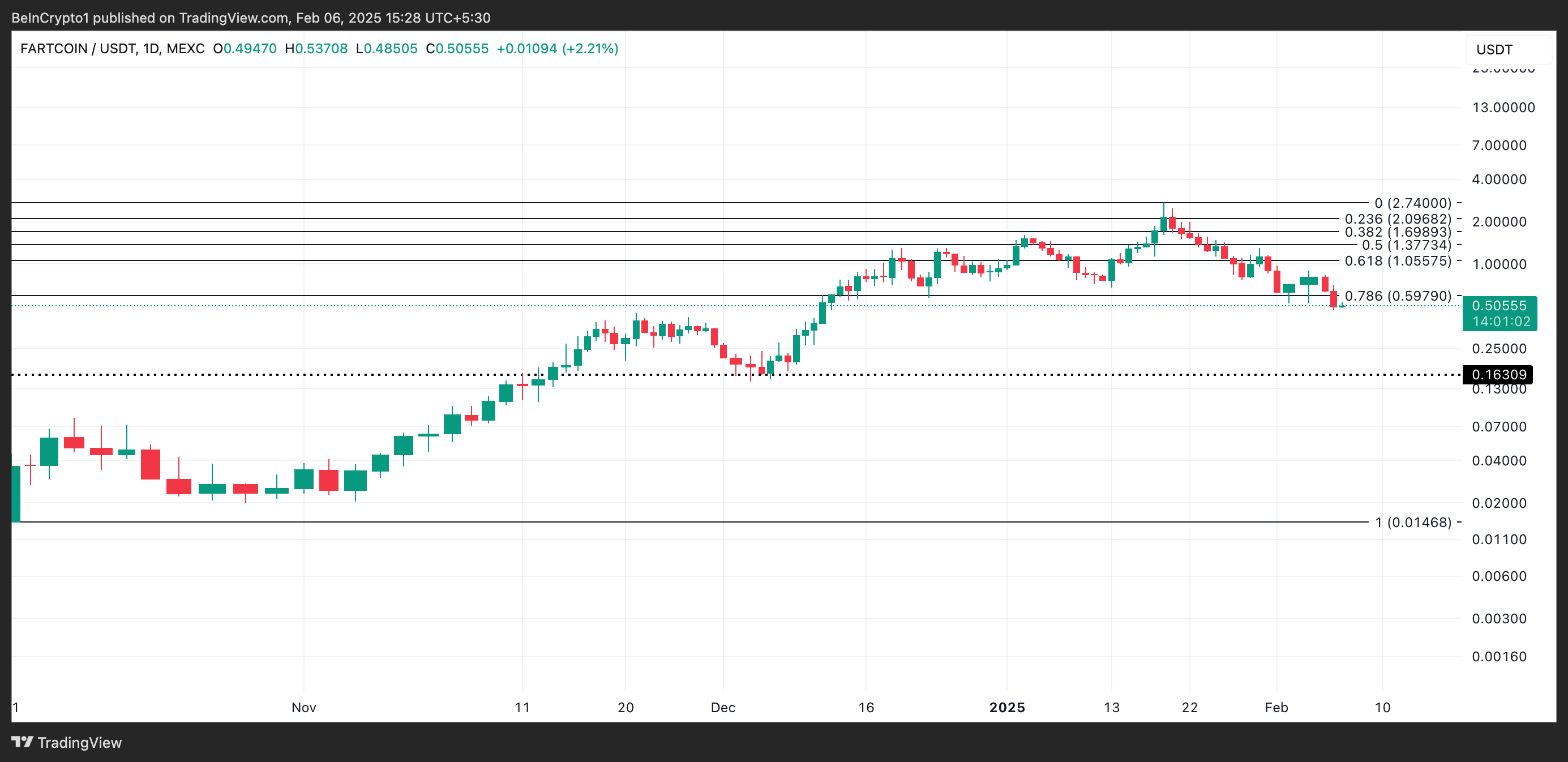 Ang Solana-based meme coin na FARTCOIN ay isa pang altcoin na trending ngayon. Nakapagtala ito ng 27% na pagbaba ng presyo sa nakaraang 24 oras at ngayon ay nagte-trade sa $0.50.