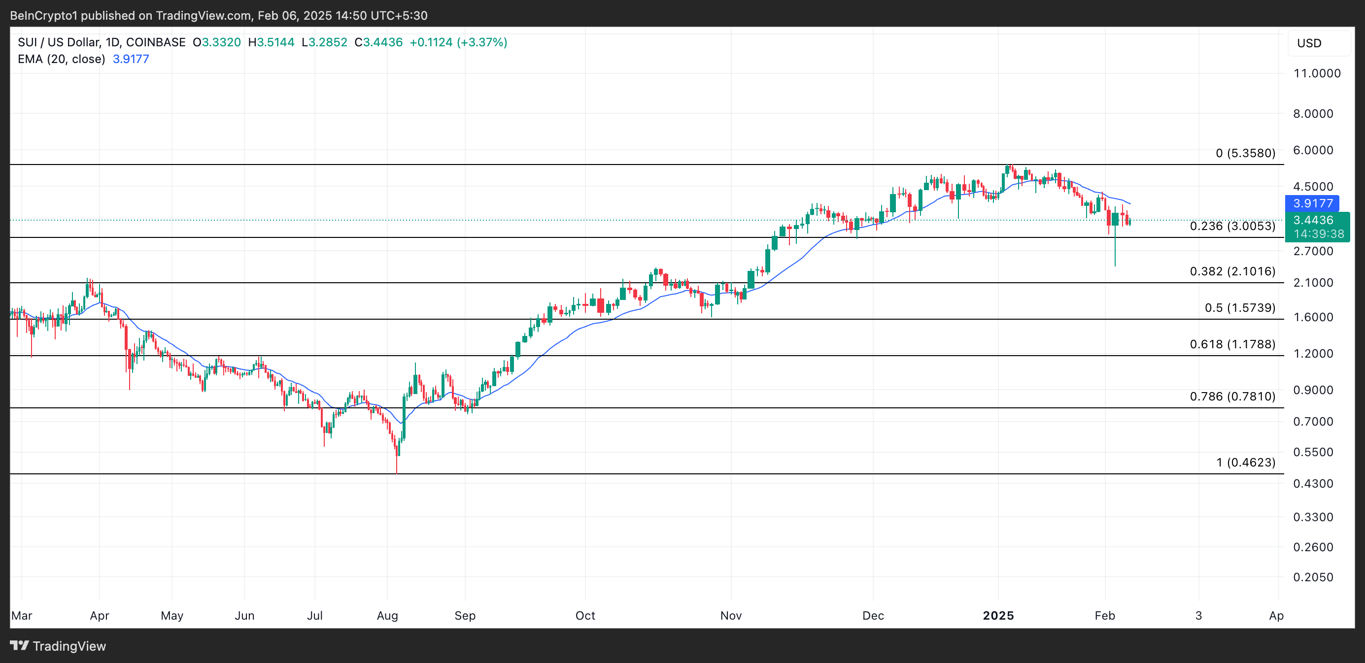 Ang pag-assess sa galaw ng presyo ng SUI sa daily chart ay nagpapakita na ito ay nagte-trade sa ibaba ng 20-day Exponential Moving Average (EMA) mula noong Enero 22.