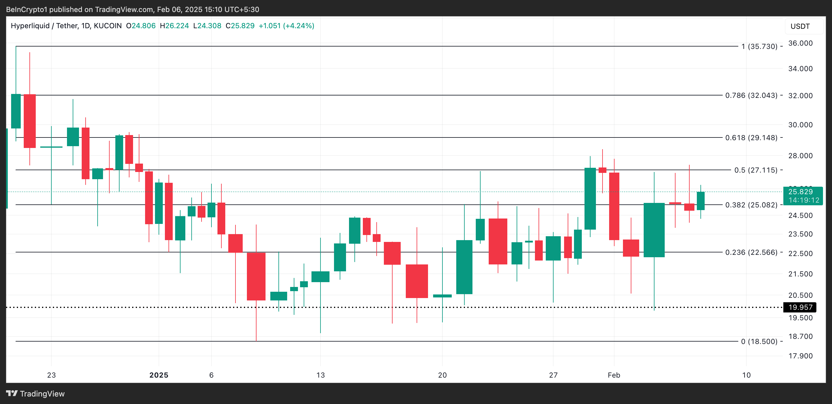 Ito ay nagpapahiwatig ng pagtaas ng user activity sa Hyperliquid blockchain. Gayunpaman, ang performance ng native coin nito, HYPE, ay tila nananatiling tahimik dahil sa mas malawak na problema sa market. Sa kasalukuyan, ang altcoin ay nagte-trade sa $25.82, na may 1% na pagbaba ng presyo sa nakaraang 24 oras.