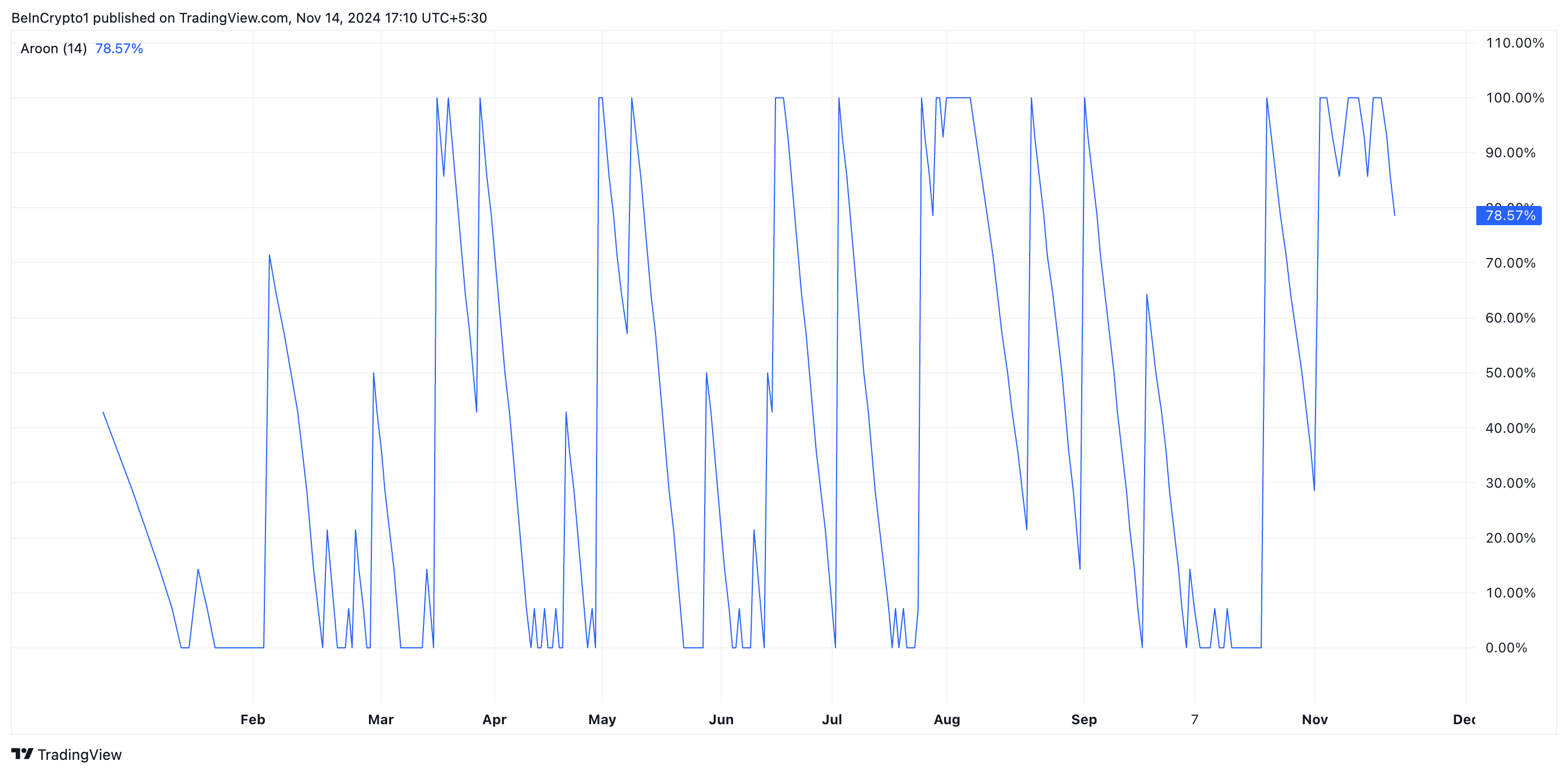 Ang Aroon indicator ay tumutukoy sa lakas at direksyon ng isang trend. Kapag ang Aroon Down Line ay malapit sa 100, ang presyo ng asset ay patuloy na gumagawa ng mga bagong mababang presyo sa panahong sinusukat. Ipinapahiwatig nito na ang asset ay nasa malakas na downtrend, na nagpapakita ng sustained bearish momentum.
