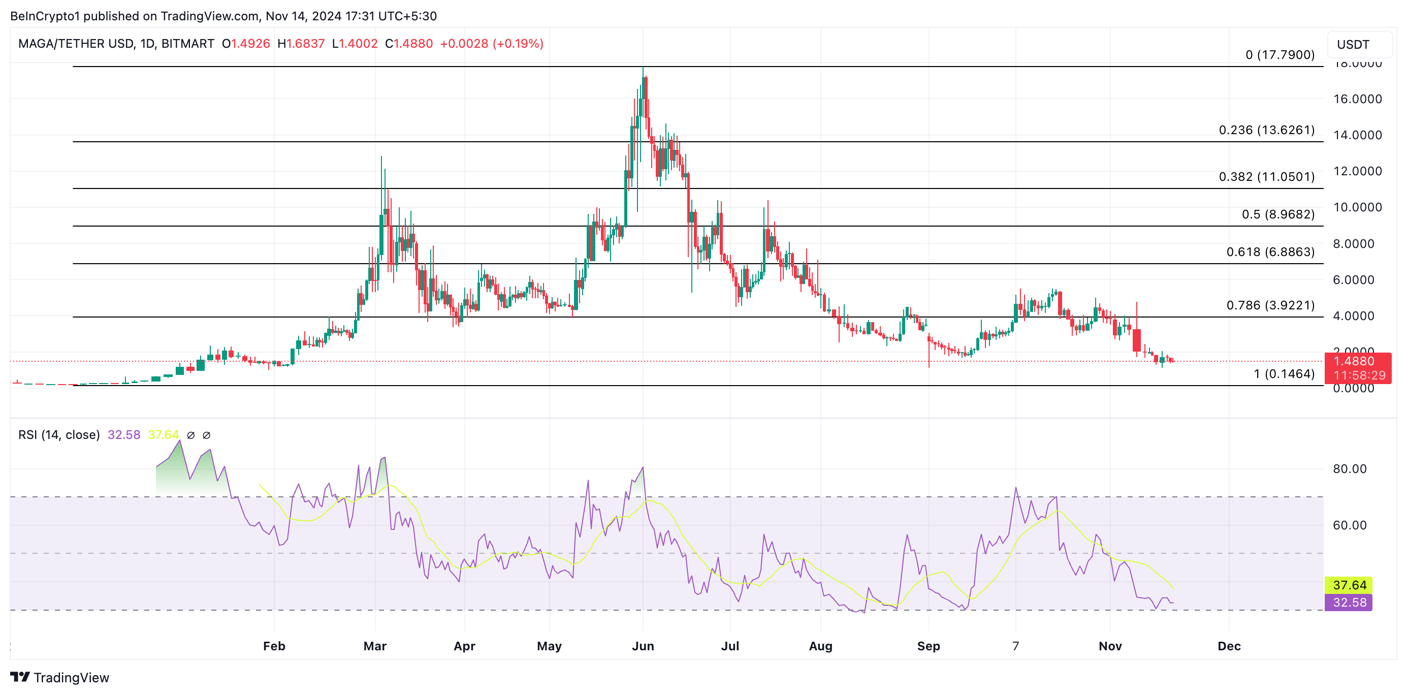 Nakaranas ng malaking pagbaba ang meme coin na konektado kay Donald Trump na MAGA (TRUMP) nitong nakaraang linggo. Ito’y kabaligtaran sa mas malawak na pagtaas ng market na sinimulan ng pagkapanalo ni Trump sa 2024 US presidential elections. Ang TRUMP ay nagte-trade sa $1.48 sa ngayon, na may 35% na pagbaba sa nakalipas na pitong araw.