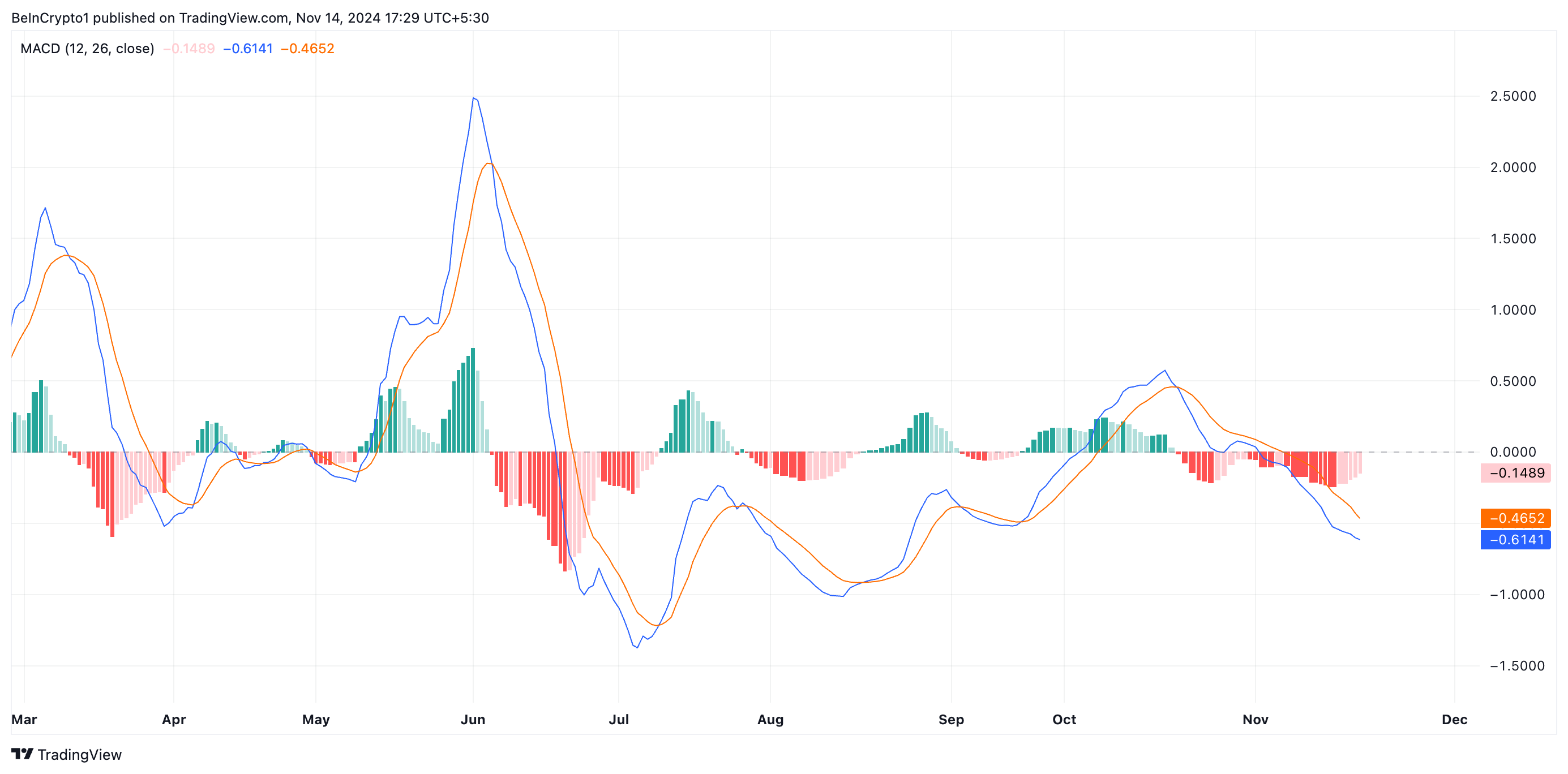 Ang indicator na ito ay sumusubaybay sa direksyon ng trend ng isang asset, mga pagbabago, at mga potensyal na punto ng pagbaliktad ng presyo. Kapag ang MACD line ay nasa ilalim ng parehong signal at zero lines, mahina ang short-term momentum ng asset, na nagpapahiwatig ng potensyal na bearish trend. Ito’y itinuturing ng mga trader bilang malakas na selling signal, dahil nagpapahiwatig ito na malamang magpapatuloy ang pagbaba ng presyo.