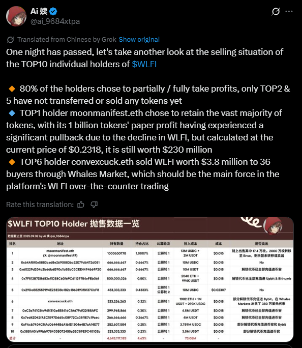 Gayunpaman, maraming investors ang nagmadaling mag-cash out pagkatapos ng launch. Ang on-chain data na naka-post sa X ay nagpapakita na 80% ng top 10 WLFI wallets ay bahagyang o ganap na naibenta. Tanging ang pangalawa at panglimang pinakamalaking wallets ang nanatiling buo.