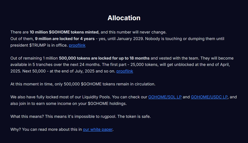 Ang unang hakbang, na naging matagumpay na, ay ang pag-launch ng $GOHOME token sa Solana blockchain gamit ang isang fair distribution model na inuuna ang first come, first serve basis. Hindi rin nagkaroon ng Airdrop ang proyekto, na tinitiyak na walang early selling pressure.