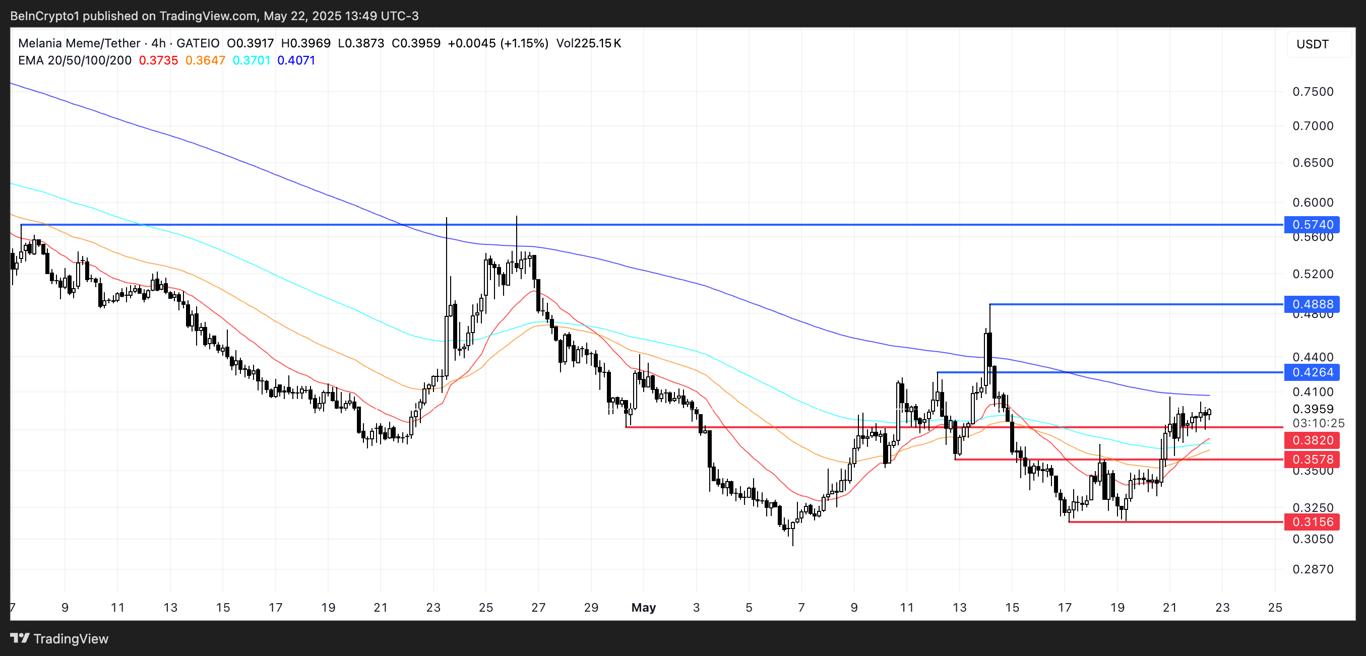 Tumaas ang token ng 12% sa nakaraang linggo, at ang EMA lines nito ay papalapit na sa golden cross formation—isang posibleng bullish signal. Kung makumpirma ito, maaaring i-test ng MELANIA ang resistance sa $0.426 at $0.488, at posibleng mag-breakout papunta sa $0.574 kung lalong lumakas ang momentum.