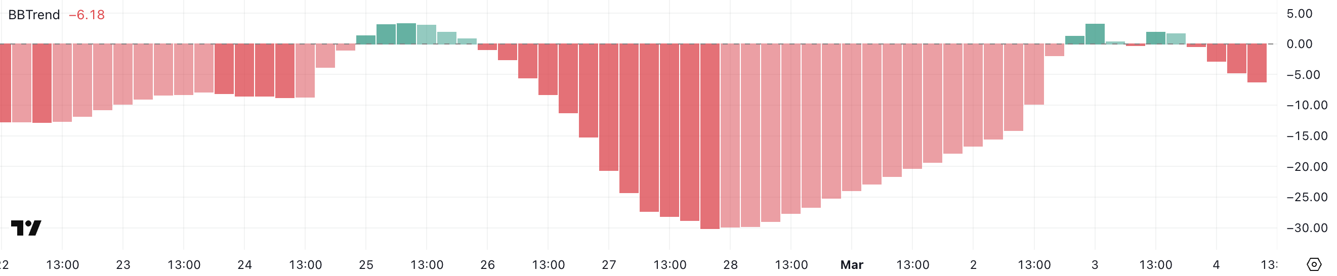 Ang BBTrend (Bollinger Band Trend) ay sumusukat sa trend strength at direction gamit ang price volatility sa loob ng Bollinger Bands. Ang mga positive values ay nagpapahiwatig ng lumalaking bullish momentum, habang ang mga negative values ay nagsa-suggest ng tumataas na downtrend.
