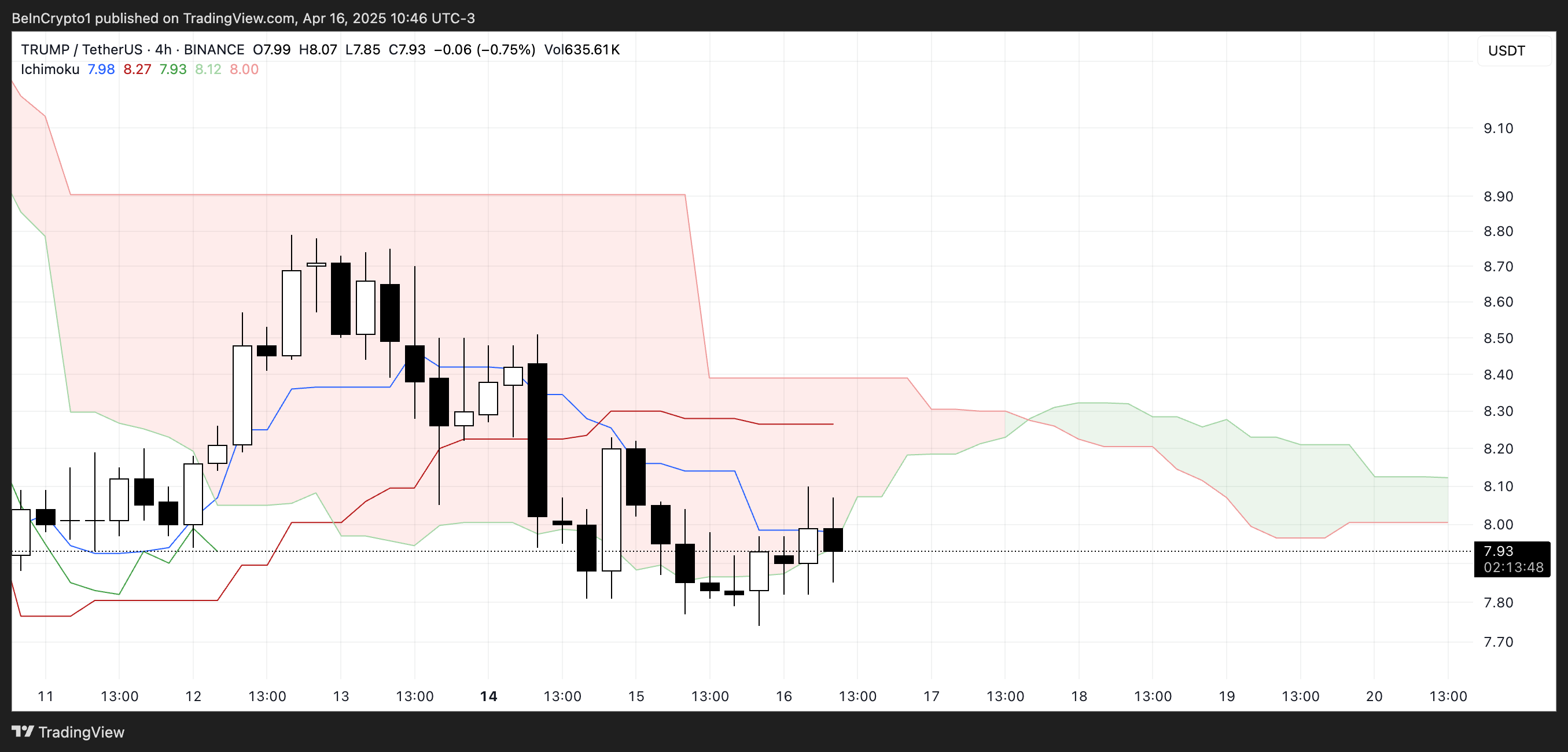 Ipinapakita ng Ichimoku Cloud chart ng TRUMP ang malinaw na bearish setup. Ang presyo ay kasalukuyang nasa ilalim ng parehong blue Tenkan-sen (conversion line) at red Kijun-sen (baseline).