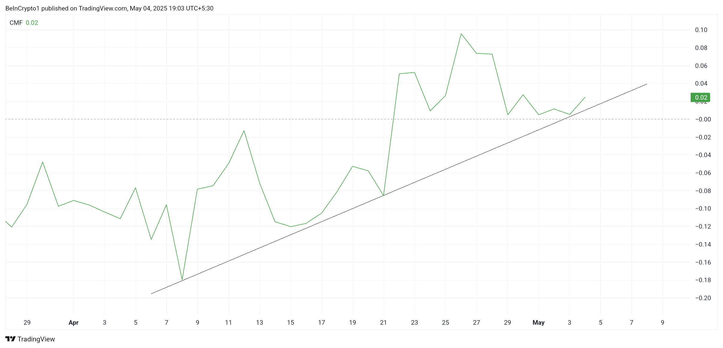 Kahit na malaki ang pagbaba ngayon, nagpapakita ang macro indicators ng positibong pananaw mula sa mga investor. Ang Chaikin Money Flow (CMF) ay nananatiling positive, na nagpapakita ng patuloy na pagpasok ng kapital sa asset. Ang bullish signal na ito ay nagpapakita na ang mga buyer pa rin ang nangingibabaw kahit na mahina ang market kamakailan.