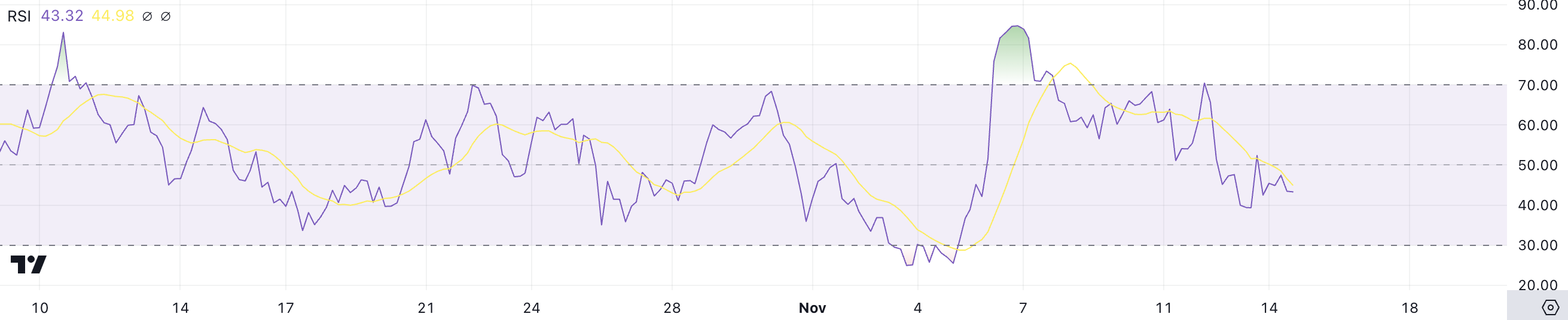 Noong Nobyembre 7, umabot sa 85 ang Relative Strength Index (RSI) ng UNI dahil sa mabilis na pagtaas ng presyo nito ng 50% sa loob lang ng 24 oras. Mula nang maabot ang high na iyon, unti-unting bumaba ang RSI at kasalukuyang nasa 43.32. Ang RSI ay isang indicator na ginagamit para sukatin ang momentum sa pamamagitan ng bilis at pagbabago ng mga galaw ng presyo, na tumutulong malaman kung ang isang asset ay overbought o oversold.
