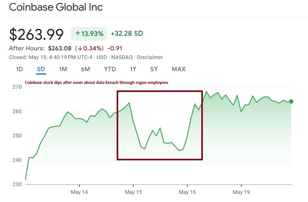 Bagamat nakaranas ng malaking paglago ang Coinbase sa stock market matapos itong maisama sa S&P 500, ang balita ng data breach nito ay nagdulot ng malaking pansamantalang pagbaba.
