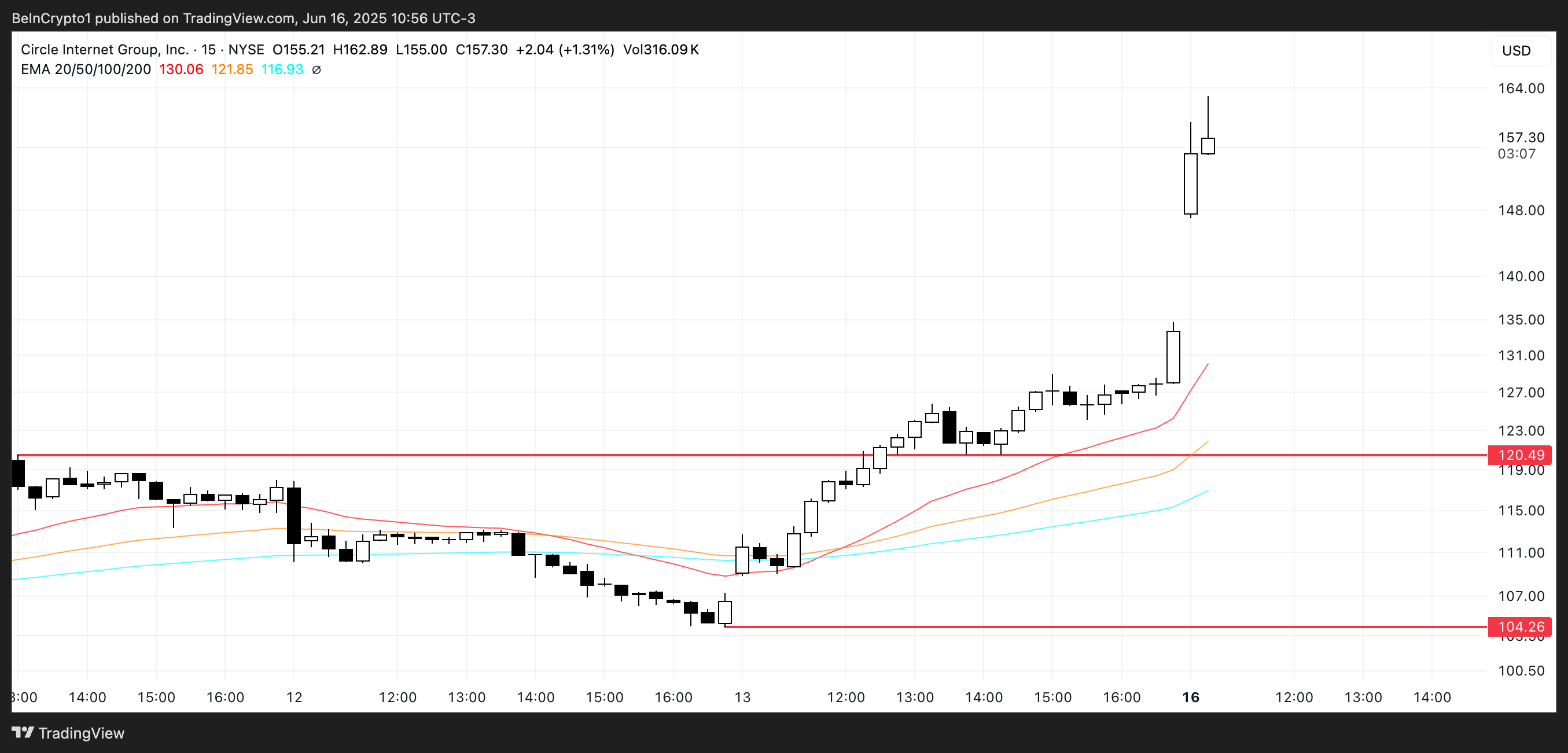 Sa kasalukuyan, nagte-trade ito sa paligid ng $158, at may ilang analysts na nag-set ng target price na kasing taas ng $300, dahil sa malakas na posisyon ng kumpanya sa stablecoin space. Pero kung humina ang momentum, ang pinakamalapit na malakas na technical support ng CRCL ay nasa $120.