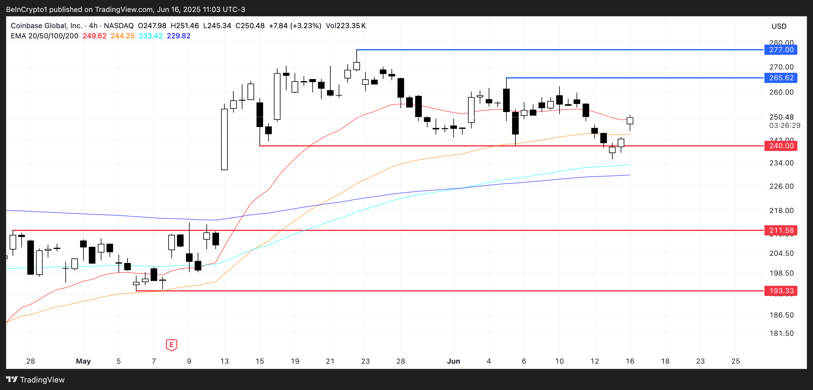 Kung muling makuha ng Coinbase ang bullish momentum na nakita noong Mayo, maaari nitong i-test ang $265 resistance level, na may $277 bilang susunod na key upside target. Pero kailangan magpatuloy ang momentum, lalo na’t nananatiling mahina ang trading volumes sa short term—isang bagay na nakikita ng mga analyst bilang potential buying opportunity imbes na red flag.