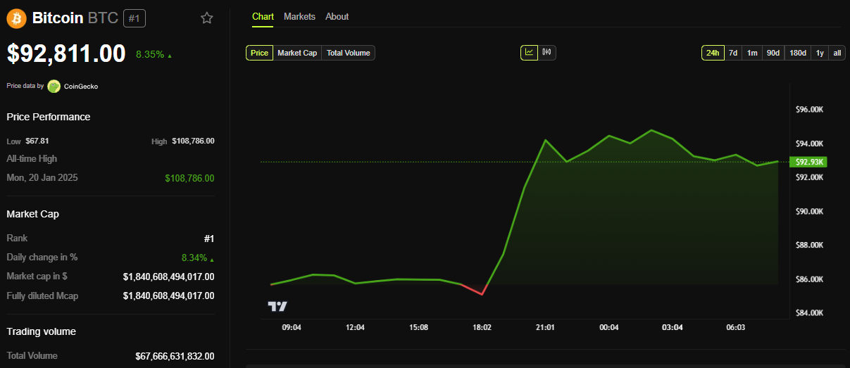 Sa kasalukuyan, ang Bitcoin ay nagte-trade sa halagang $92,811, tumaas ng mahigit 8% mula nang magbukas ang session noong Lunes. Sa limang data points na ito na paparating, halos tiyak na magkakaroon ng volatility.