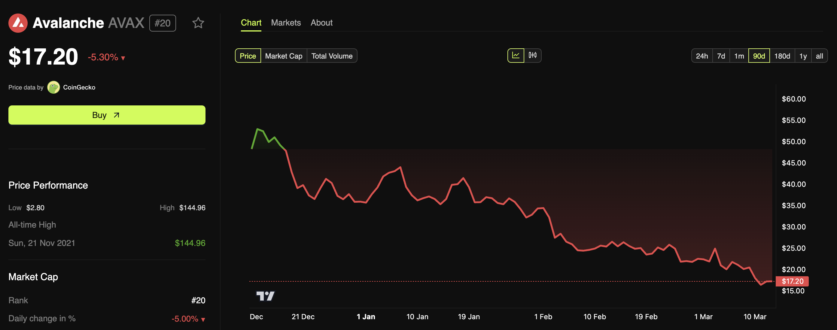 Sa kasalukuyan, ang trading price ng AVAX ay nasa $17.2, na may 5.3% na pagbaba sa nakalipas na 24 oras. Ang performance nito sa nakaraang linggo ay nagpapakita ng pagbaba ng 14.7%.