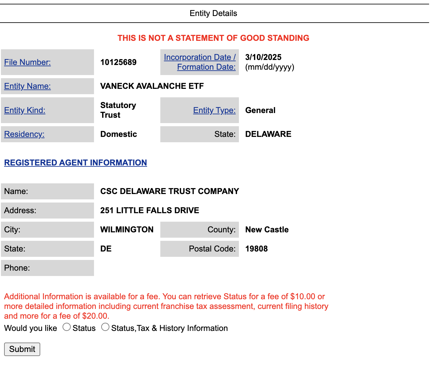 Ayon sa opisyal na website, ang VanEck Avalanche ETF trust ay na-incorporate noong March 10, na may file number 10125689.