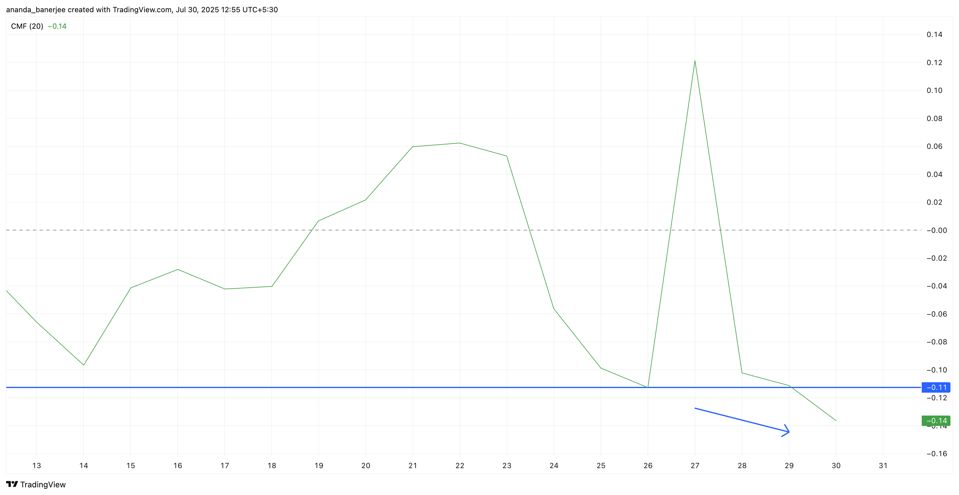 Ang Chaikin Money Flow (CMF), na sumusukat kung pumapasok o lumalabas ang kapital sa market, ay bumagsak nang husto sa -0.14, mas mababa pa sa mga level bago nagsimula ang VINE price rally ngayong buwan. Ipinapakita nito na mas malakas ang selling pressure kaysa sa pag-accumulate ng mga whales.