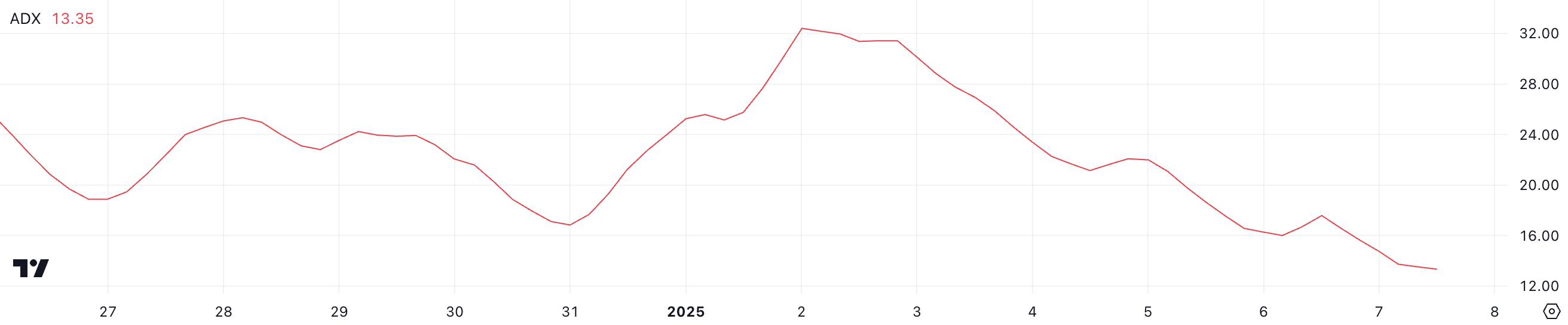 VIRTUAL Average Directional Index (ADX) ay patuloy na bumababa sa kasalukuyang level na 13.3, mula sa 32.4 noong January 2. Ang ADX ay isang mahalagang technical indicator na ginagamit para sukatin ang lakas ng trend, kahit ano pa ang direksyon nito, sa scale na 0 hanggang 100. Ang mga value na higit sa 25 ay nagpapakita ng malakas na trend, habang ang mga value na mas mababa sa 20 ay nagsasaad ng mahina o walang momentum.