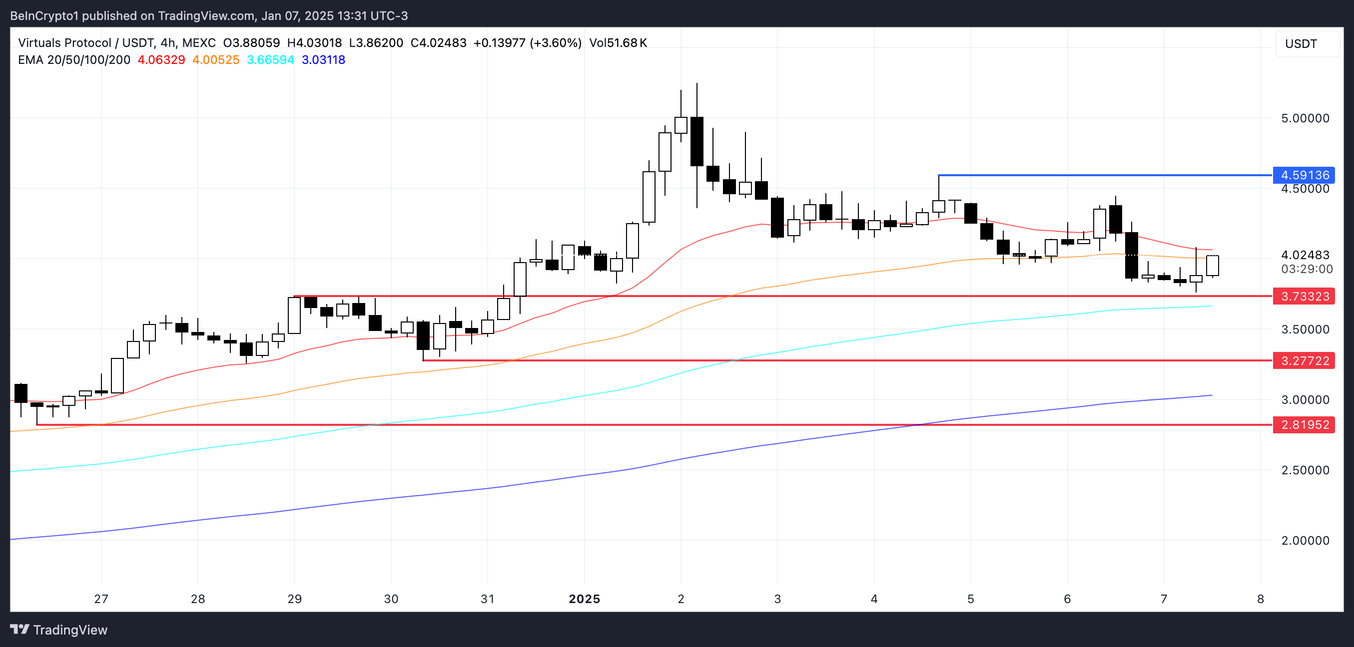 Kung magkaroon ng bagong uptrend, maaaring i-challenge ng presyo ng VIRTUAL ang resistance sa $4.59. Ang breakout ay posibleng magtulak sa presyo nito na lumampas sa $5, na magmamarka ng isa pang milestone.