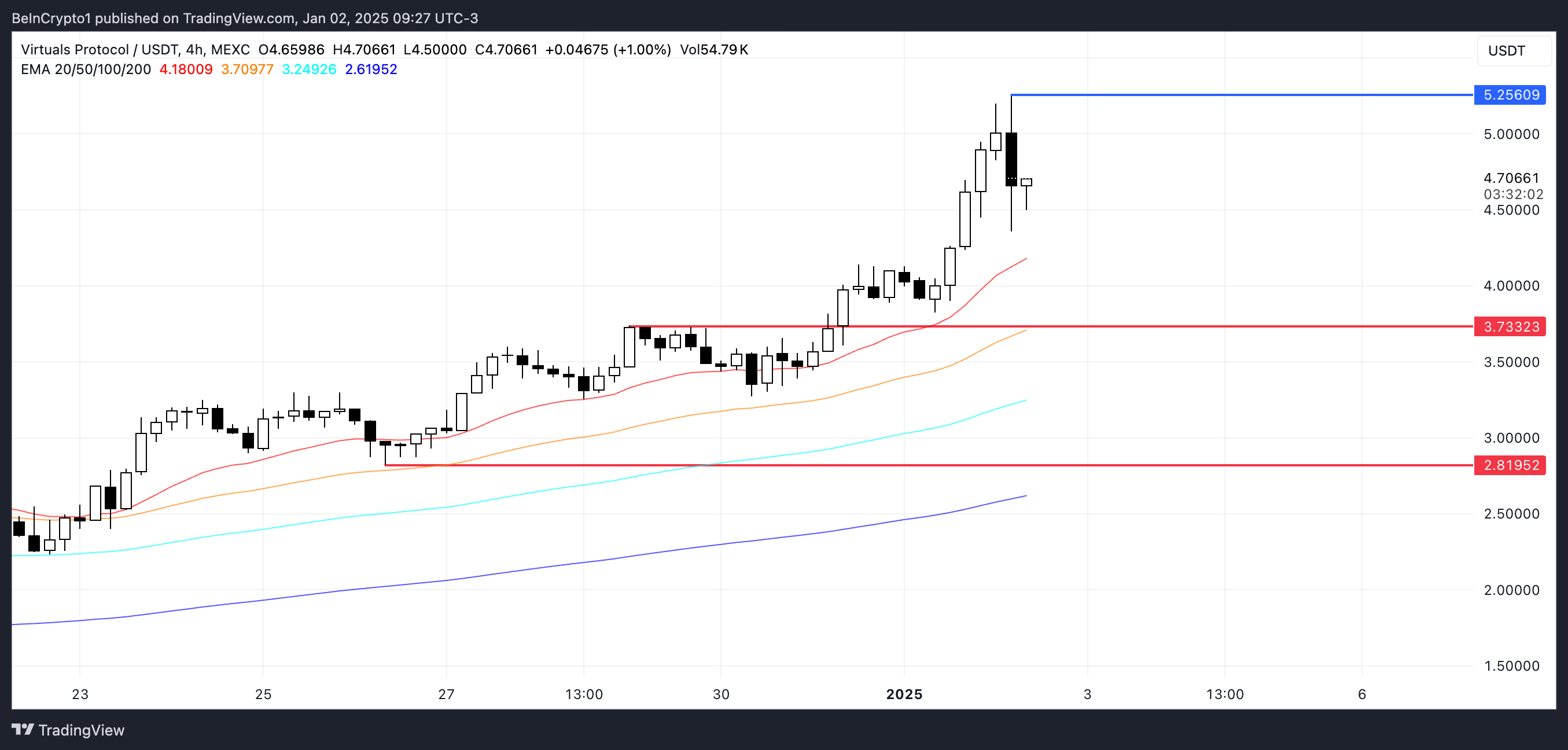 VIRTUAL price ay nagtatakda ng mga bagong all-time high nitong mga nakaraang araw, lumampas sa $5 sa unang pagkakataon noong Enero 1, 2025.