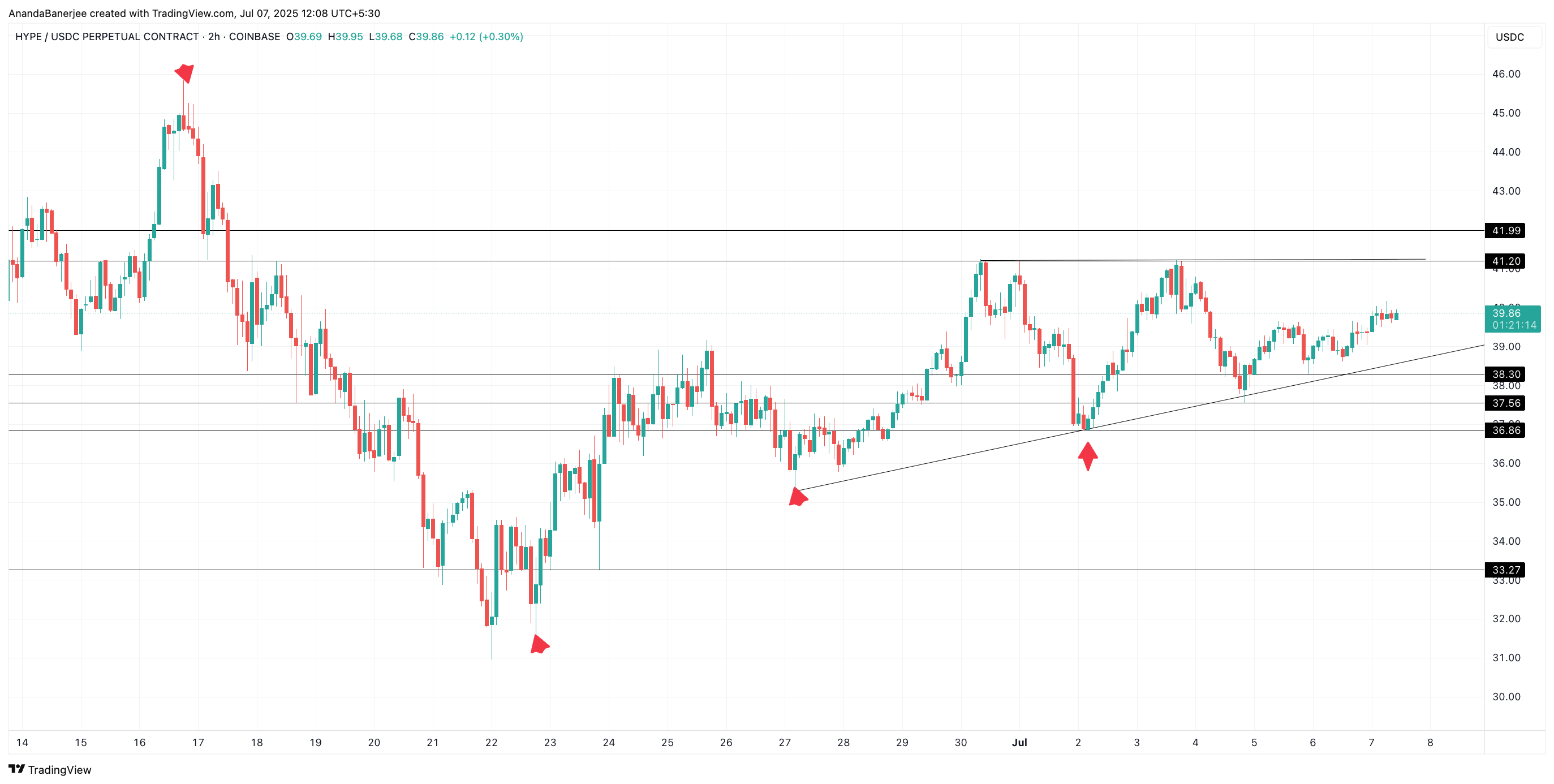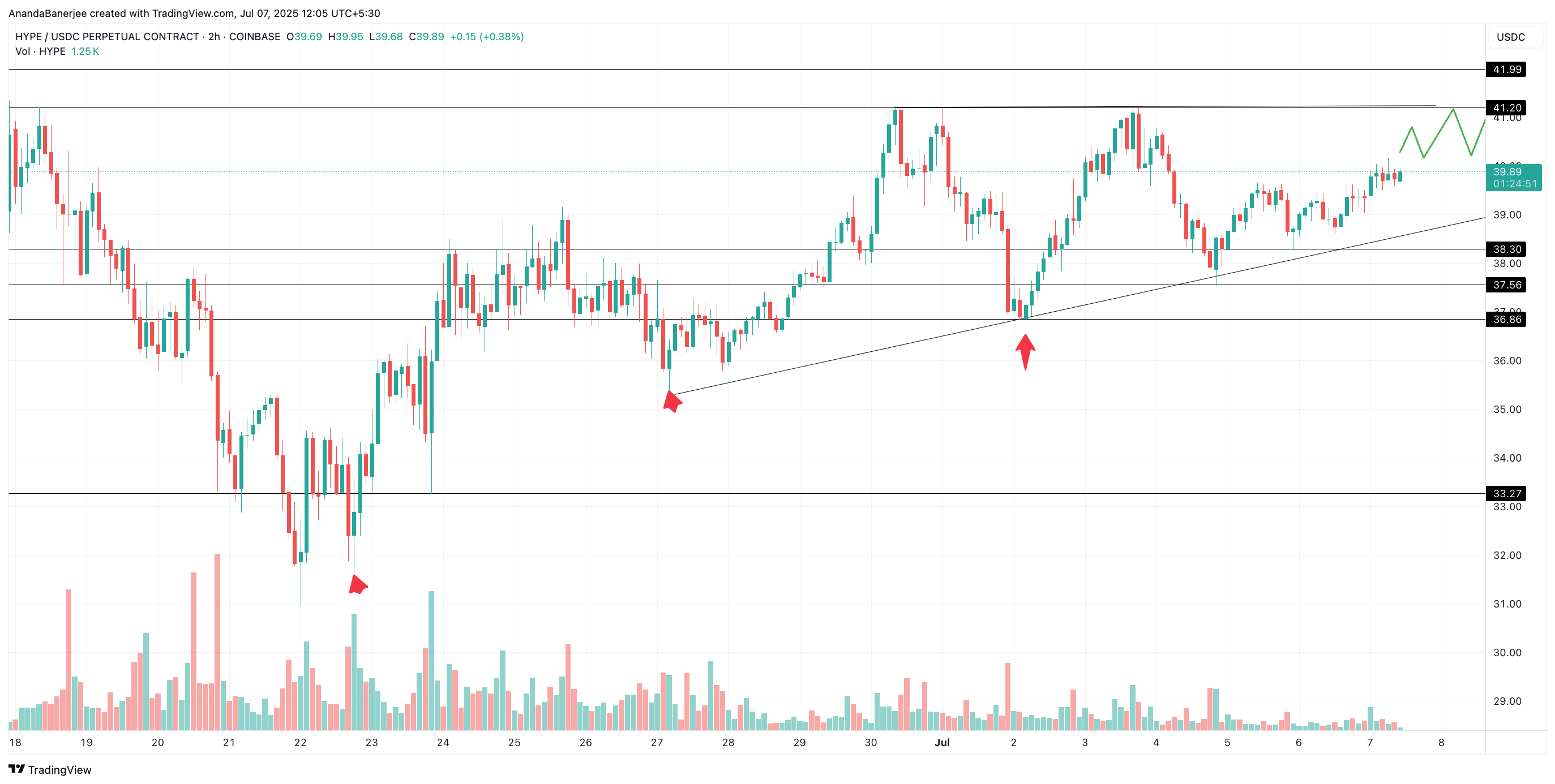 Patuloy na nagte-trade ang HYPE sa loob ng isang rising wedge sa hourly timeframe, na may mas mataas na lows mula noong June 27 at resistance na nabubuo malapit sa $41. Kung ang presyo ay mag-break sa ibabaw ng wedge at mag-hold sa ibabaw ng $42 na may volume, maaaring maipit ang mga shorts sa isang matinding squeeze.