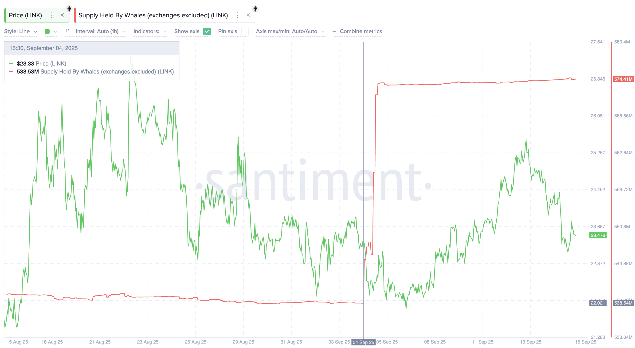 Patuloy na nagdadagdag ng kanilang Chainlink positions ang mga crypto whales bago ang FOMC meeting, kung saan inaasahan ng mga merkado ang isang mahalagang pagbabago sa policy. Mula September 4, ang hawak ng mga whale ay lumago mula 538.54 milyong LINK hanggang 574.41 milyong LINK. Sa kasalukuyang presyo ng LINK na $23.50, ito ay nasa $843 milyon na bagong accumulation.