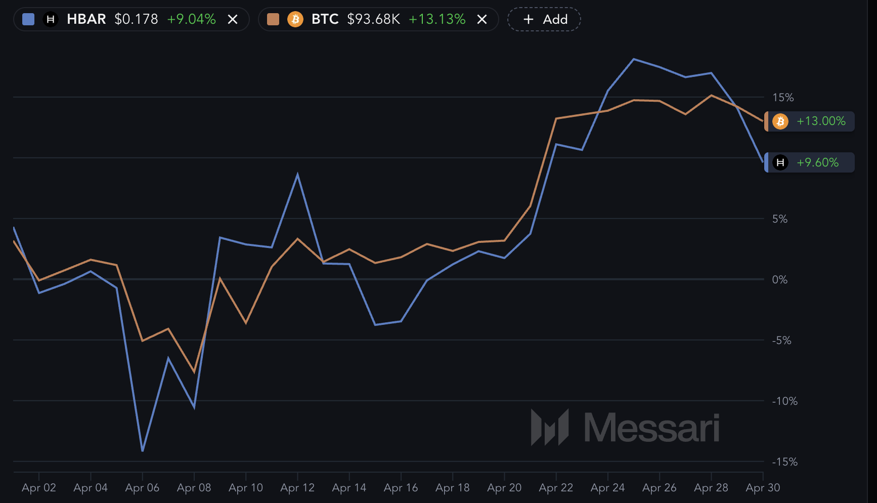 Kamakailan, nagpakita ang HBAR ng mataas na correlation sa Bitcoin (BTC), madalas na pinapalakas ang galaw ng mas malawak na crypto market leader.