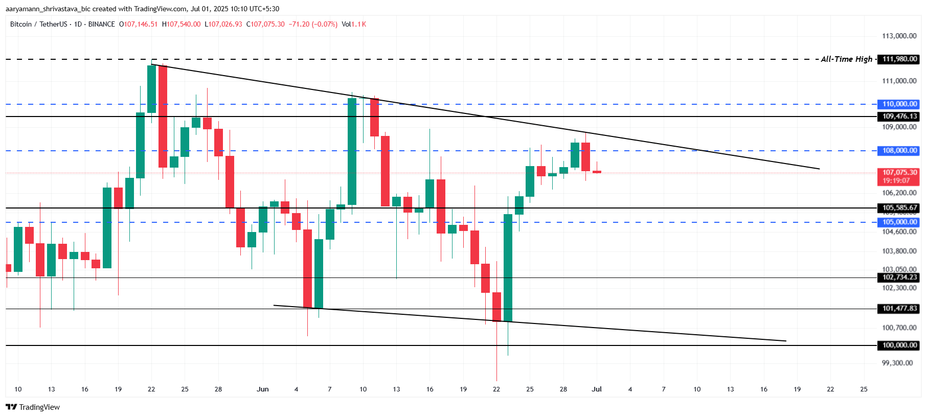 Sa kasalukuyan, nasa $107,075 ang trading ng Bitcoin, nahihirapan itong makuha ang $108,000 level bilang suporta. Pinapatibay nito ang formation ng descending wedge, isang pattern na lumakas nitong nakaraang buwan. Ang pagkabigo na mapanatili ang $108,000 ay nagpapakita ng patuloy na pababang pressure na nararanasan ng Bitcoin sa market.