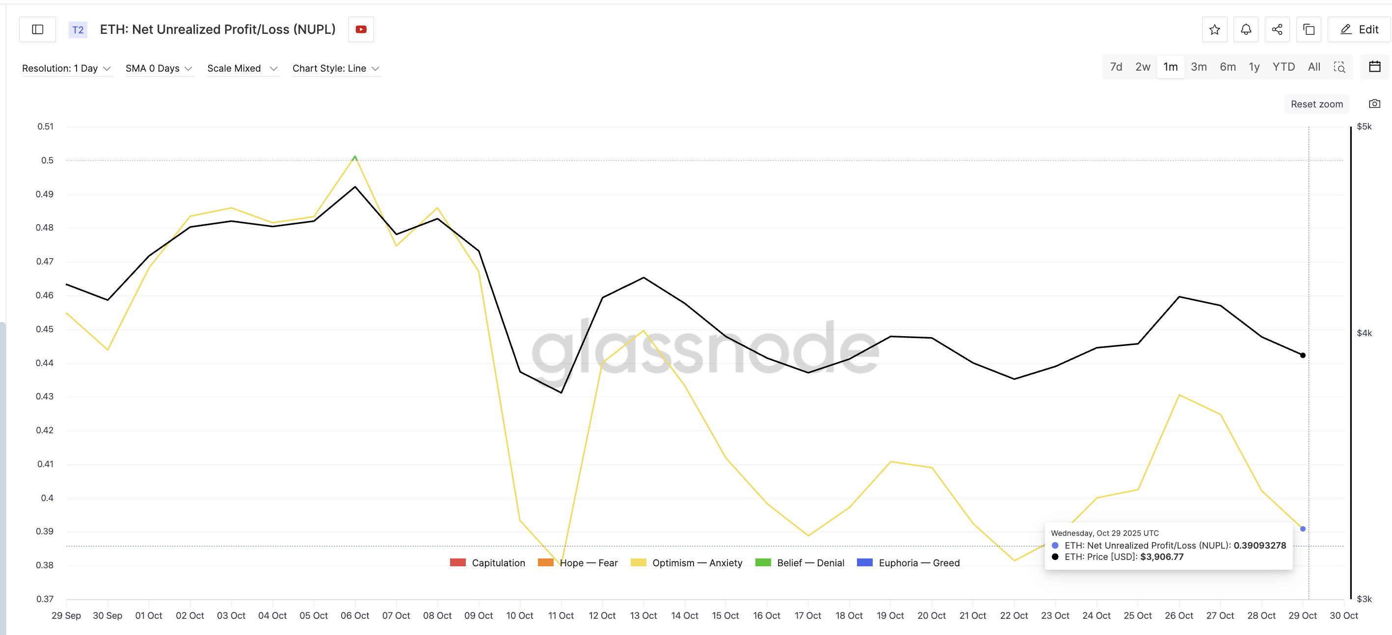 Ang Net Unrealized Profit/Loss (NUPL) — sukat kung kumikita o lugi ang mga investor — ay bumaba mula 0.43 papuntang 0.39 mula October 26, katumbas ng 9.3% na decline. Malapit ito sa monthly low na 0.38, level na dati nag-trigger ng 13% jump sa presyo ng ETH (mula $3,750 papuntang $4,240).