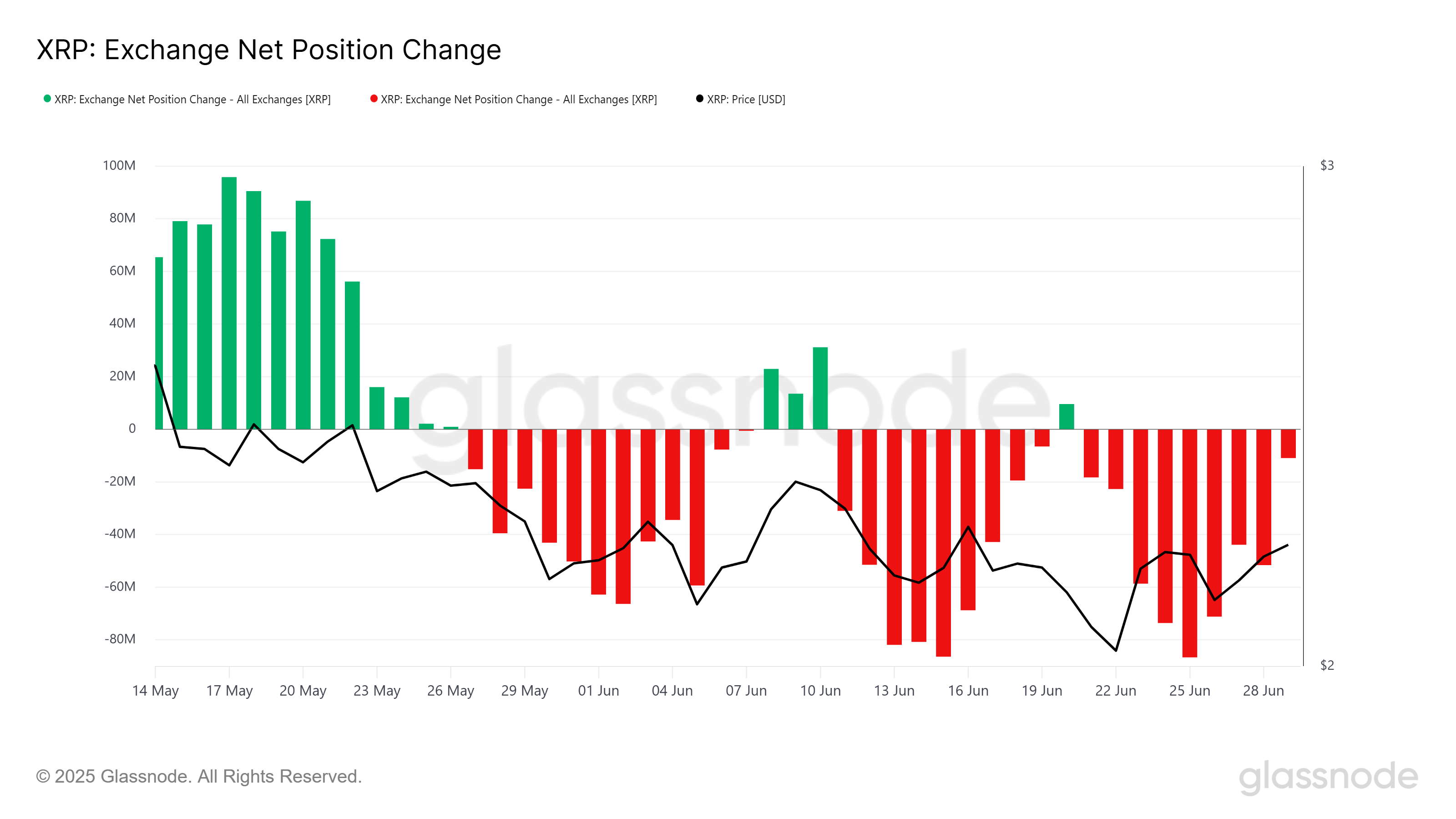Ang overall market momentum para sa XRP ay naapektuhan ng exchange net position changes, na nagpapakita ng kakulangan ng conviction mula sa retail investors. Nitong nakaraang buwan, ang pattern ng buying at selling sa exchanges ay pabago-bago, na walang malinaw na trend na lumilitaw.