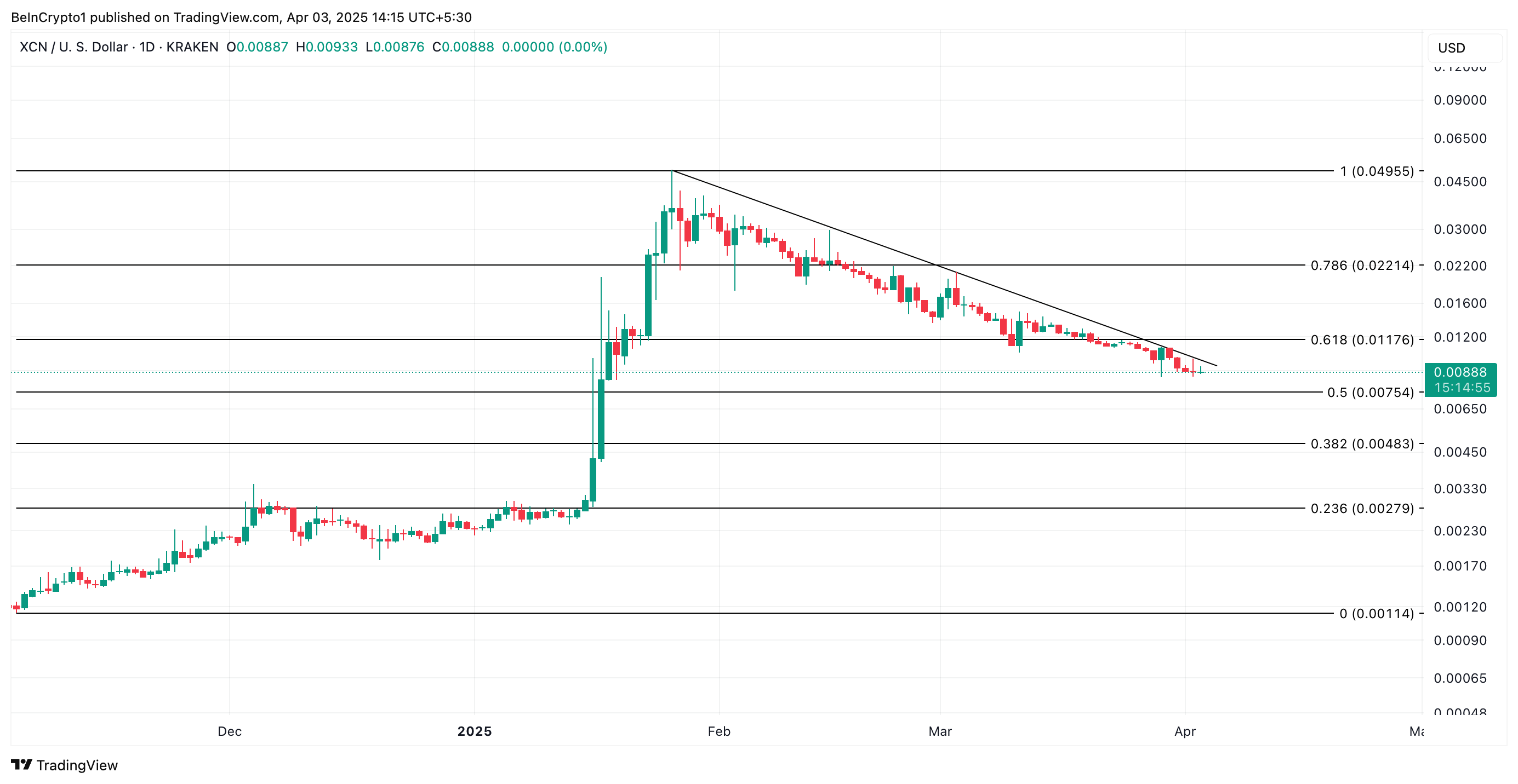 Ang XCN ay nag-trade sa ilalim ng descending trend line simula noong Enero 26. Sa kasalukuyan, nagte-trade ito sa $0.0088, at mula noon ay bumagsak ng 78%.