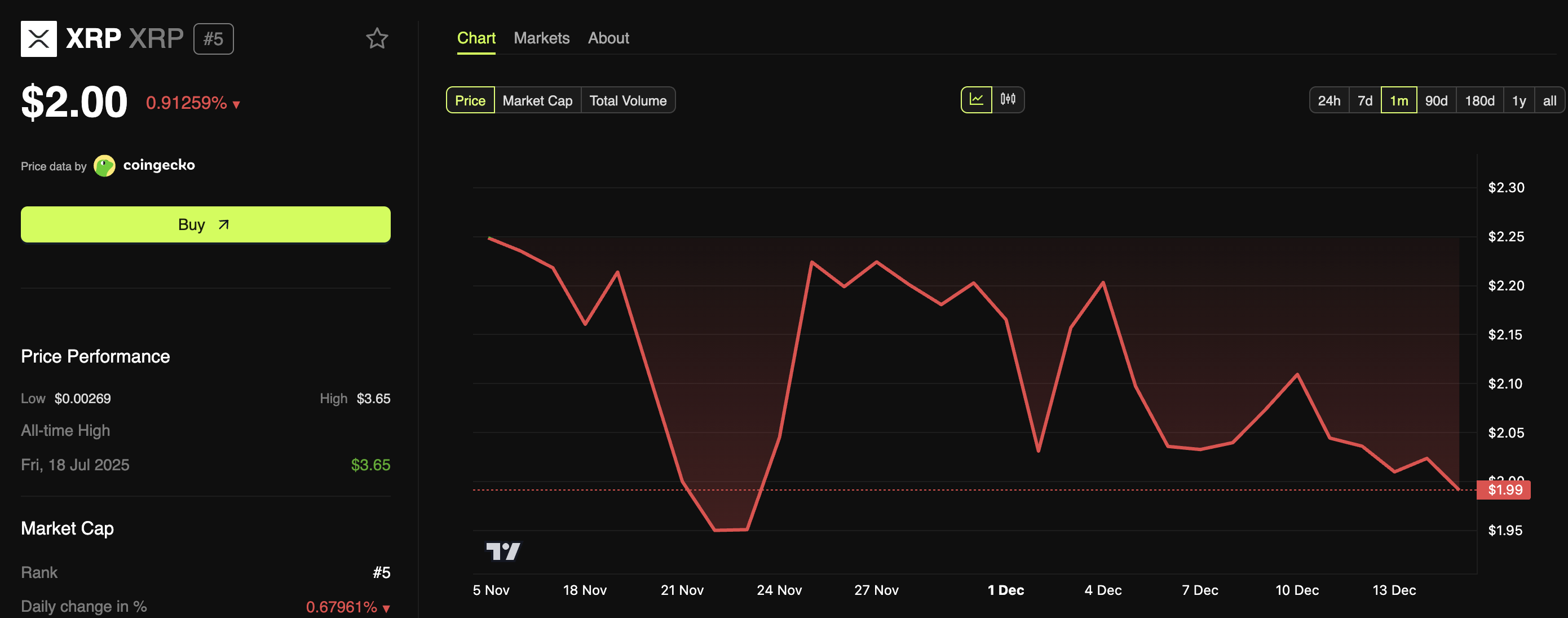 Base sa BeInCrypto Markets data, halos 13% ang binaba ng XRP nitong nakaraang buwan. Sa ngayon, nagte-trade ito sa $2.00, o bagsak ng 0.91% sa loob ng 24 oras.