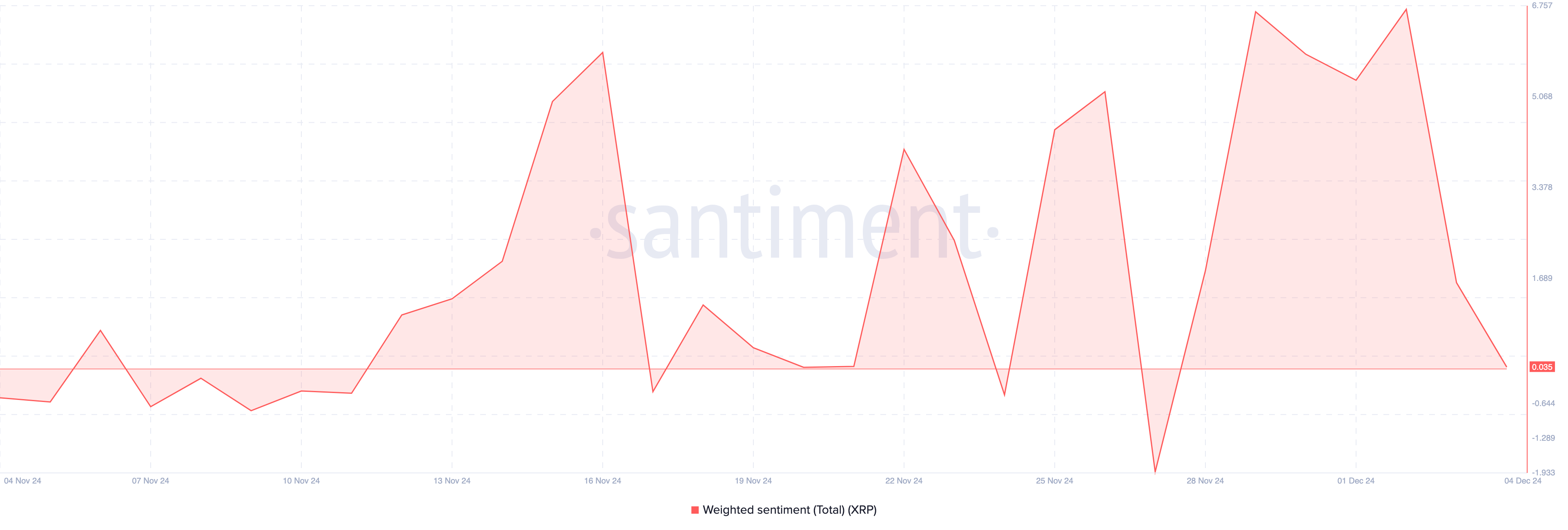 Sinabi rin ng Santiment na ang Weighted Sentiment ng XRP ay bumagsak nang malaki, mula 6.75 hanggang 0.035. Ang Weighted Sentiment ay sumusukat sa market perception, kung bullish o bearish ang pananaw ng mga participants sa isang cryptocurrency.